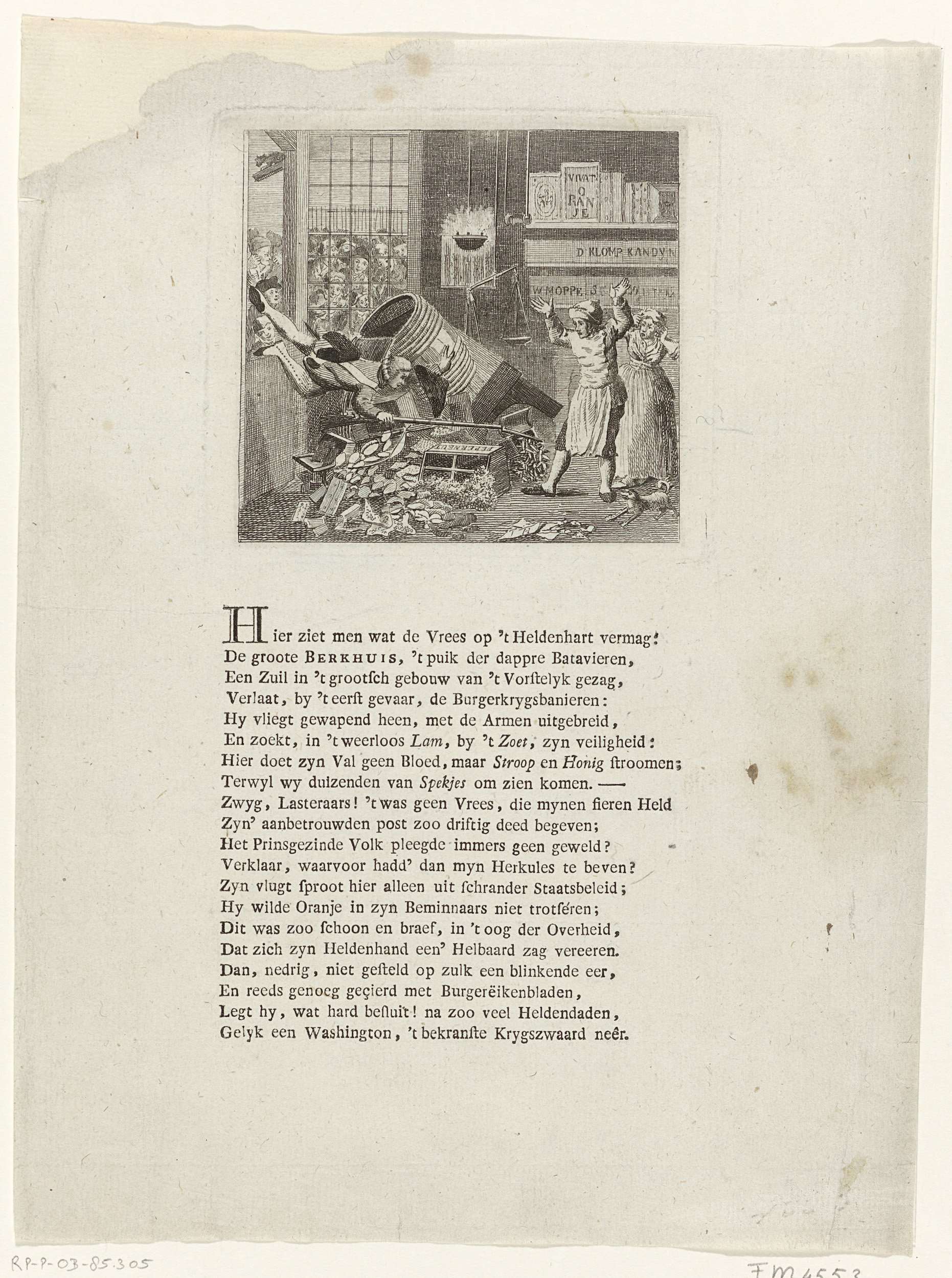 Spotprent op de adelborst Antonie Berghuis van de Negende Burgercompagnie te Rotterdam, die tijdens het geweld op 3 april 1784 in een suikerwinkel Het Lam vluchtte en in de stroop viel. Op met blad onder de plaat een vers van 20 regels.