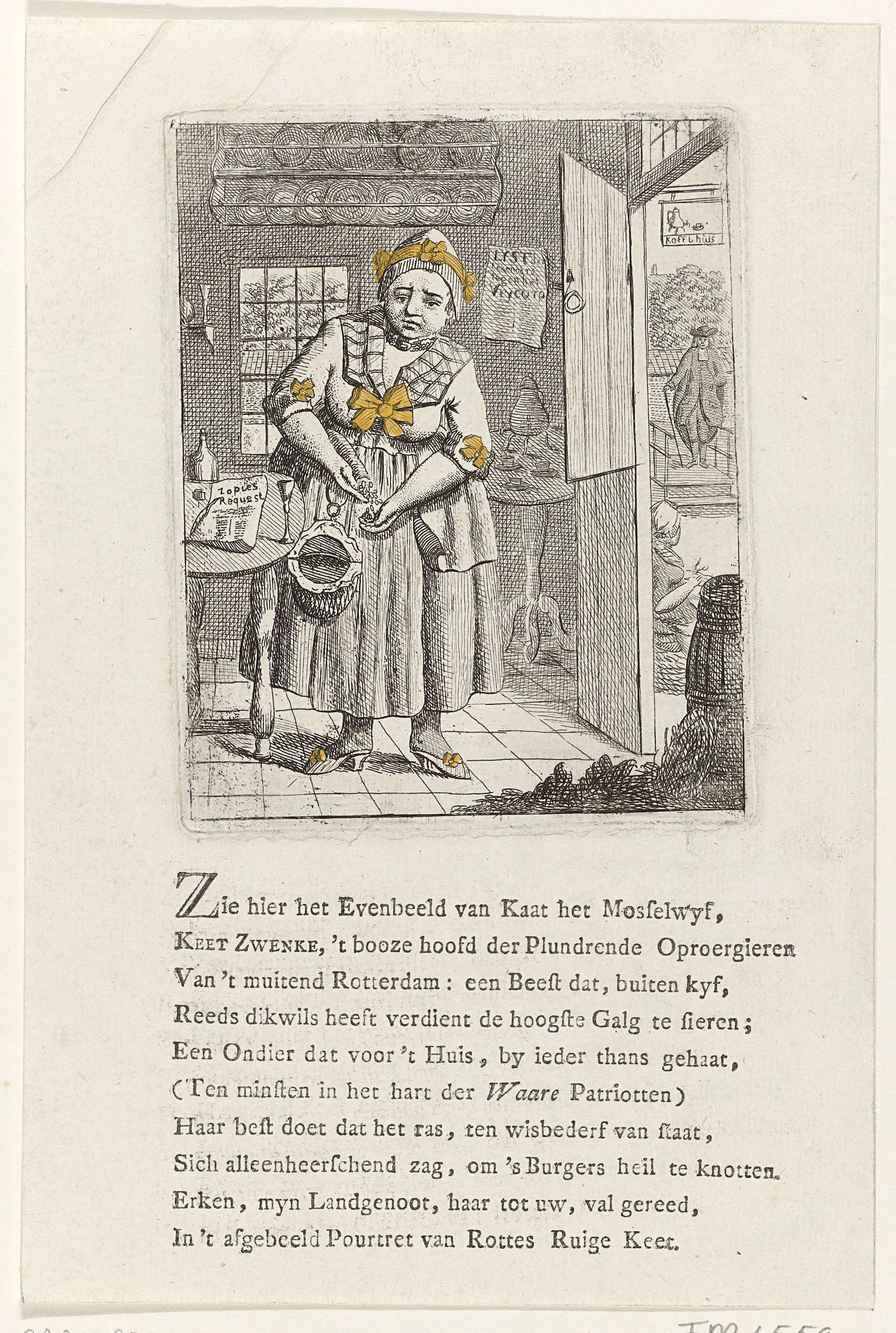 Patriotse spotprent op Ruige Keet (Keet Zwenke of Cornelia Toppen), 1784. De vrouw versierd met Oranjestrikken telt geldstukken uit een beurs in een koffiehuis. Op tafel ligt het Zopies Request. Op het blad onder de plaat een tienregelig vers.