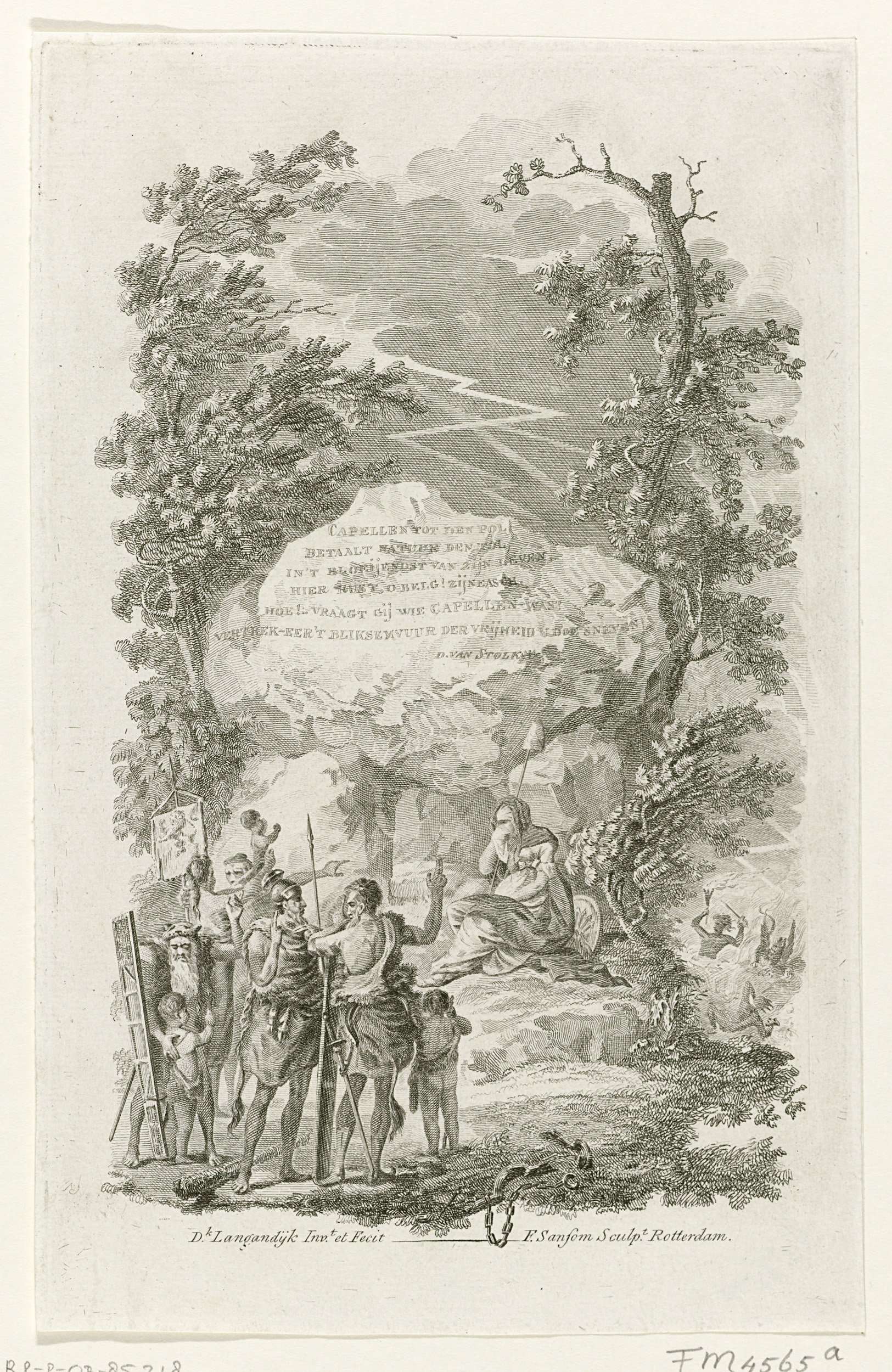 Allegorie op het overlijden van Joan Derk van der Capellen tot den Pol, 6 juni 1784. Een groep Bataven wijst naar een vers op de overledene op de deksteen van een hunebed. Onder de rots zit de treurende Nederlandse Maagd. Vanuit de wolken bliksemschichten.