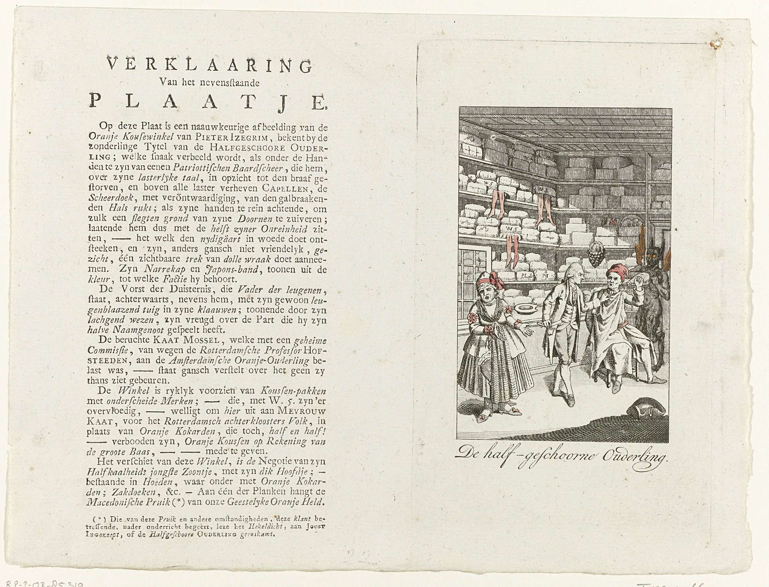 Spotprent op de prinsgezinde ouderling en kousenverkoper Pieter Joosten die zich in zijn kousenwinkel in Amsterdam laat scheren door een patriotse barbier, augustus 1784. Joosten laat zich hierbij dusdanig laatdunkend uit over de dood van Joan Derk van der Capellen tot den Pol dat de kapper weigert hem verder te scheren. Links Kaat Mossel, rechts ...