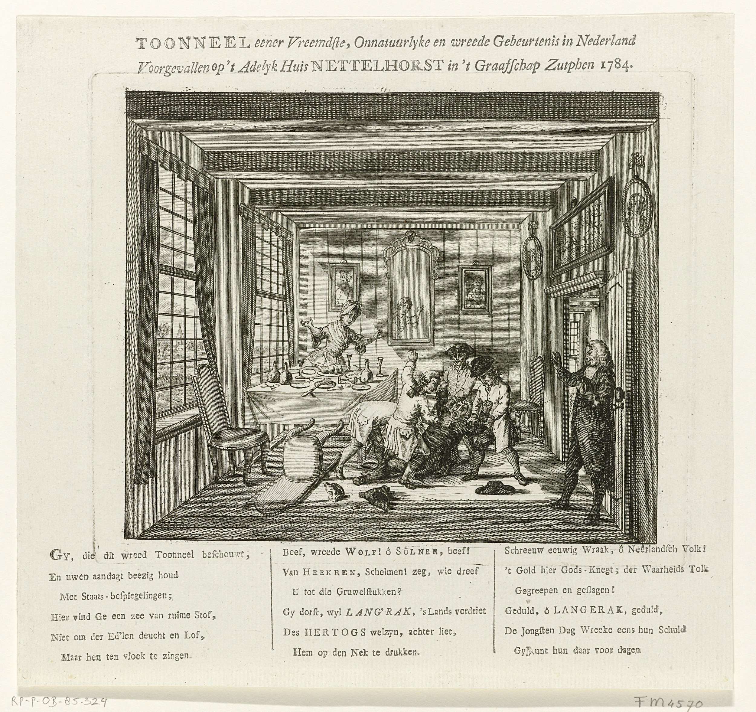 Mishandeling van de predikant Langerak uit Laren op het Huis Nettelhorst bij Lochem door baron van Heeckeren, burgemeester De Wolff van Lochem en de heer Sölner omdat de predikant weigerde te drinken op de gezondheid van de hertog van Brunswijk, juli 1784. In de deuropening kijkt de Lochemse predikant Abbink goedkeurend toe. Op het blad ...