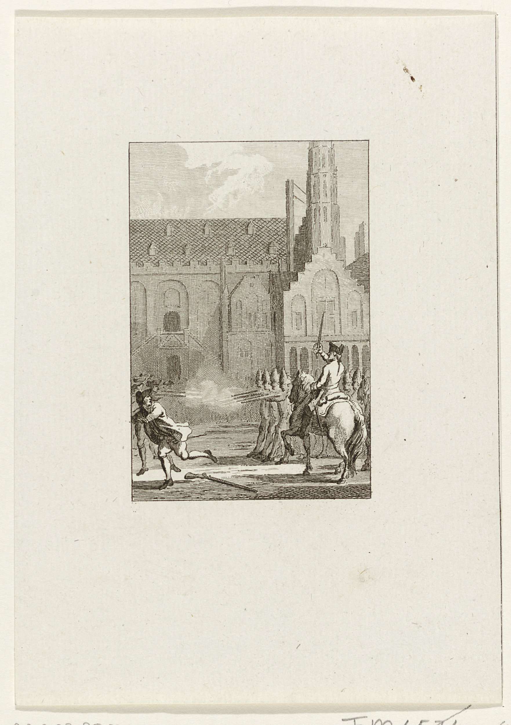Militie opent het vuur op de oproerige burgers voor het stadhuis op de Grote Markte te Haarlem tijdens het Pachtersoproer, januari 1750. Door Muller ten onrechte beschreven als: Confrontatie tussen burgerpatrouille en militaire patrouille te Arnhem, 1784.