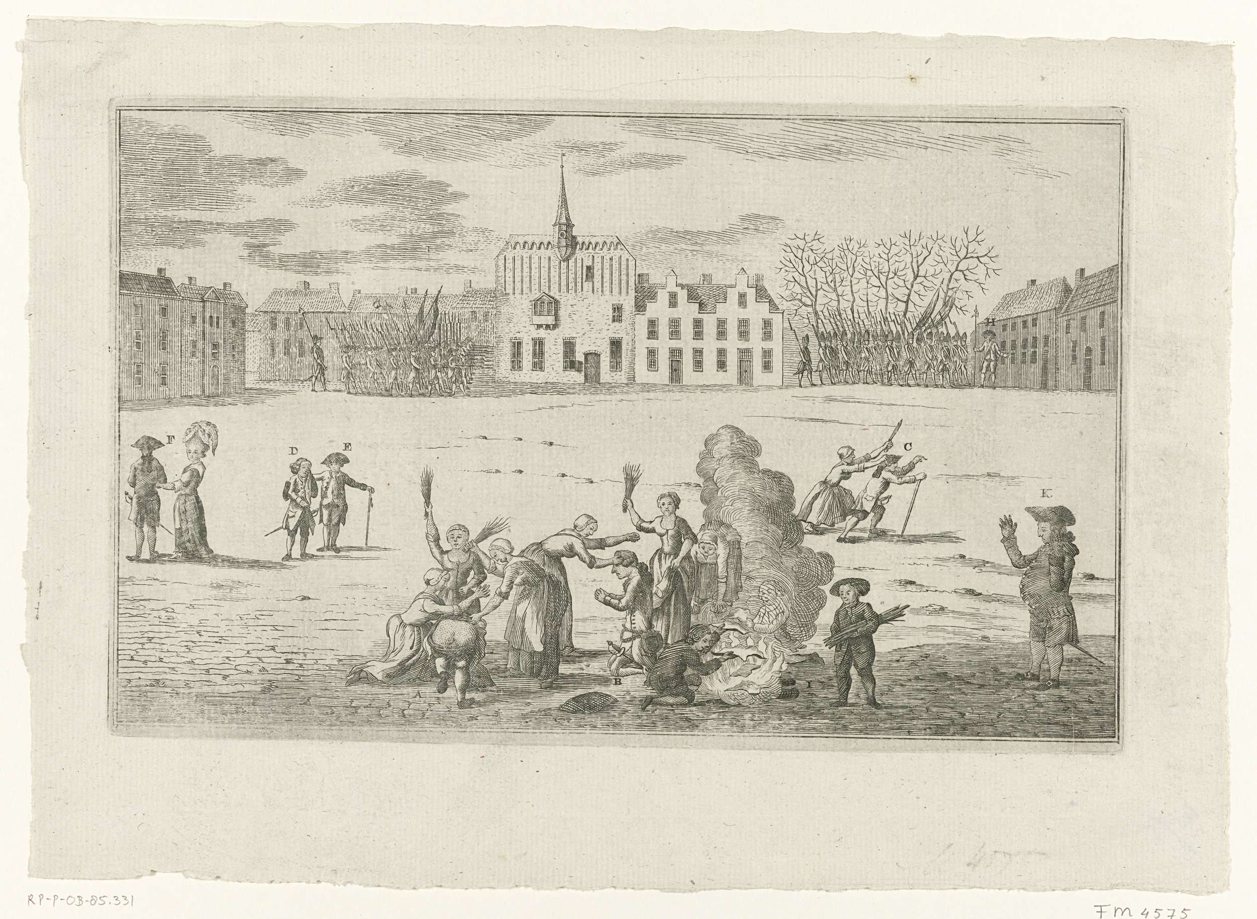 Spotprent waarin de Arnhemse burgemeesters Gosen Geurt Bentinck en Hent Brantsen op de markt voor het stadhuis door vrouwen met takkenroedes worden gekastijd, 1784. Links Brantsen met ontbloot achterwerk, rechts knielt de smekende Bentinck. Op de achtergrond patrouilleren militairen en burgers voor het stadhuis van Arnhem. Bij de prent behoort een tekstblad met uitleg van ...