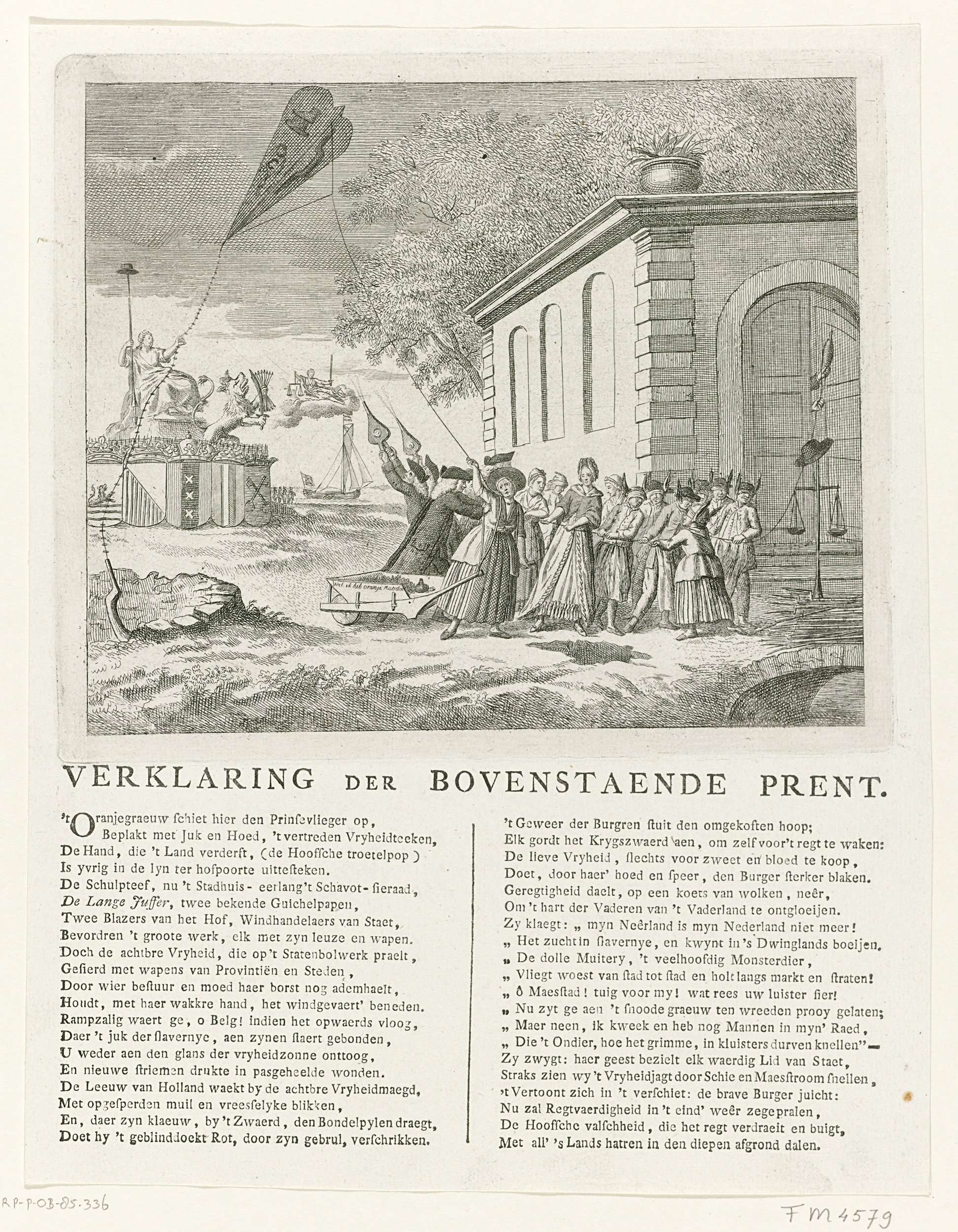 Spotprent op de prinsgezinden te Rotterdam, bij de komst van een commissie namens de Staten van Holland om onderzoek te doen naar het oproer van 3 april 1784. Kaat Mossel, Ruige Keet, Petrus Hofstede en andere oranjegezinden met ezelsoren proberen de prinselijke vlieger met het juk van de dwingelandij op te laten. Links de Nederlandse ...