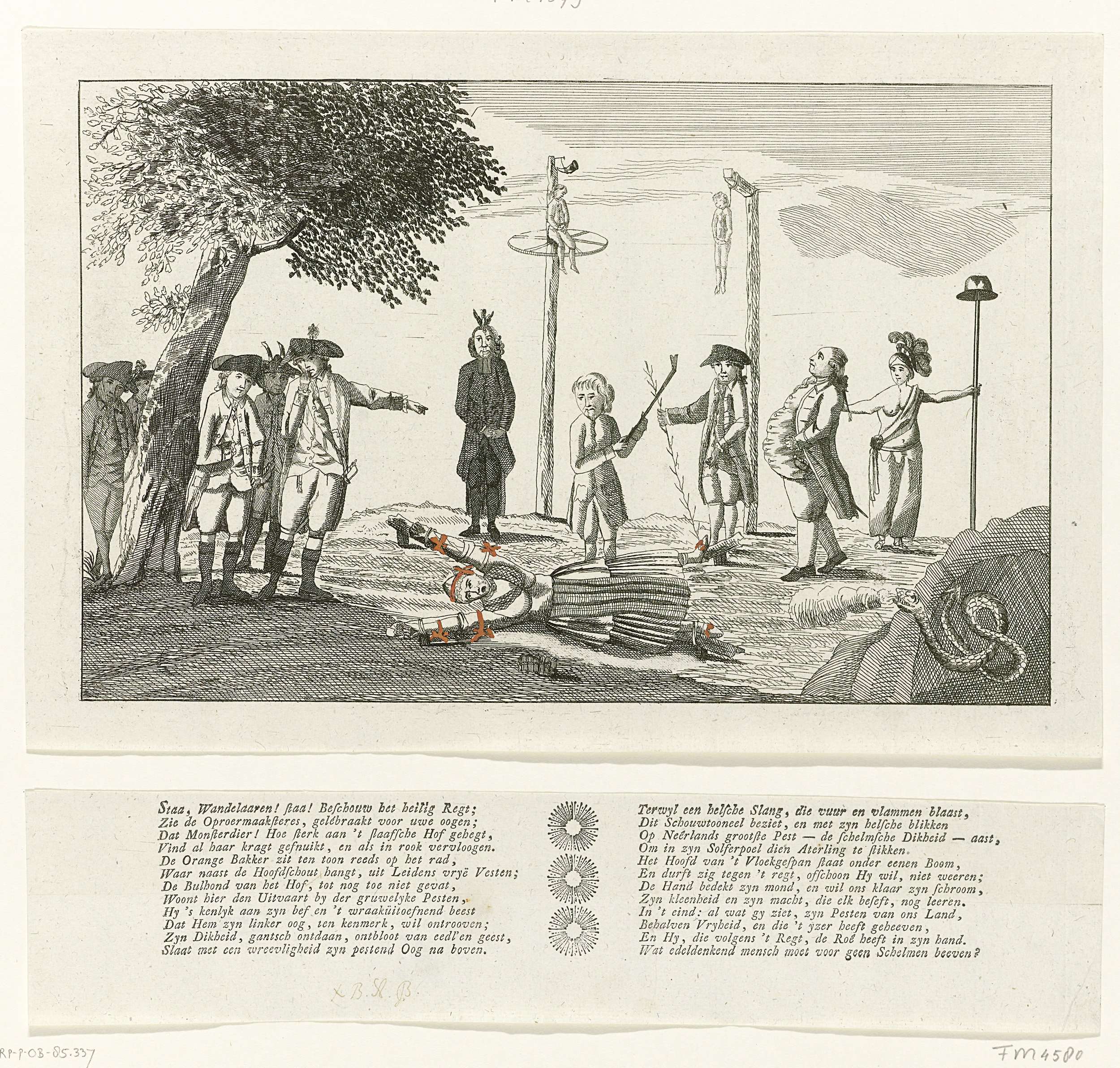 Spotprent waarin prinsgezinden worden gemarteld en terechtgesteld. Kaat Mossel met oranjestrikken vastgebonden op een kruis om door de beul geradbraakt ('gelebraakt') te worden. De Leidse bakker Adriaan Trago zit al geradbraakt op een rad en de Leidse hoofdschout Brender à Brandis hangt aan de galg. De predikant Petrus Hofstede en de hertog van Brunswijk wacht ...