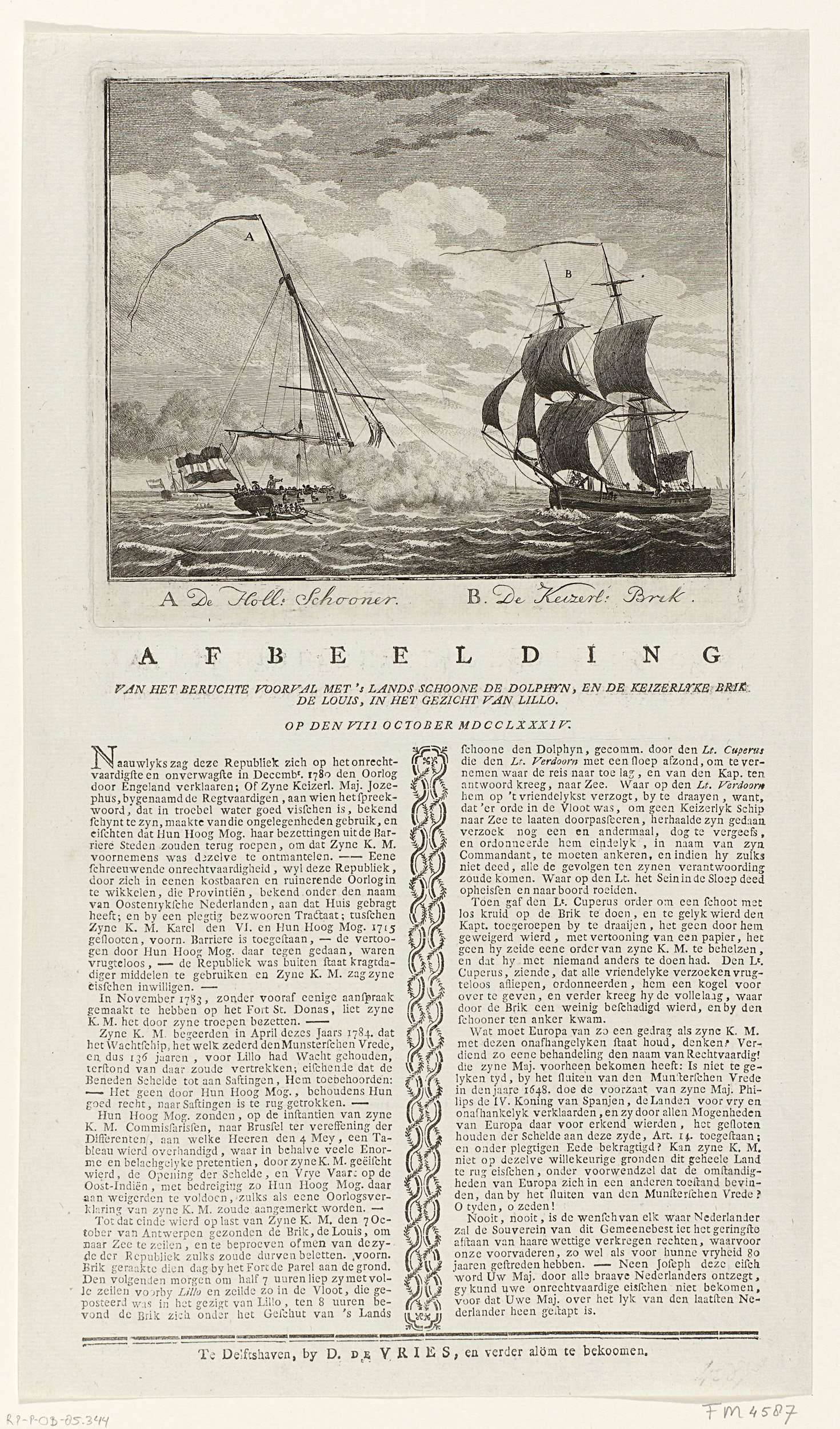 Het incident met de Oostenrijkse keizerlijke brik de Louis en de Nederlandse schoener de Dolphijn onder commando van luitenant Tobias Tak Cuperus op de Schelde, 8 oktober 1784. Het Nederlandse schip vuurt een waarschuwingsschot. De incidenten op deze dag worden aangeduid met de spotnaam de Keteloorlog. Op het blad onder de plaat een beschrijving van ...