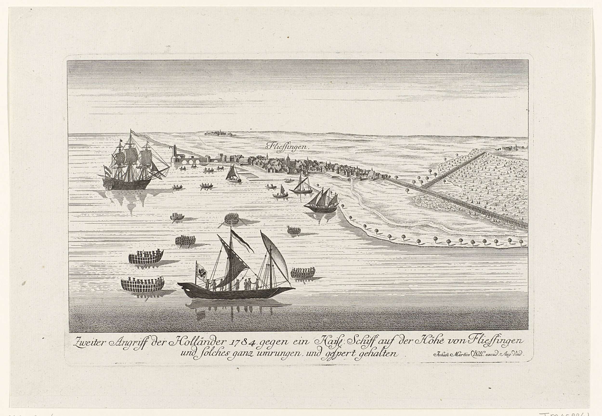 Het omsingelen van de Oostenrijkse keizerlijke brik de Louis door Nederlandse schepen op de Schelde bij Vlissingen, 8 oktober 1784. De incidenten op deze dag worden aangeduid met de spotnaam de Keteloorlog. Bij deze prent behoort een pendant.