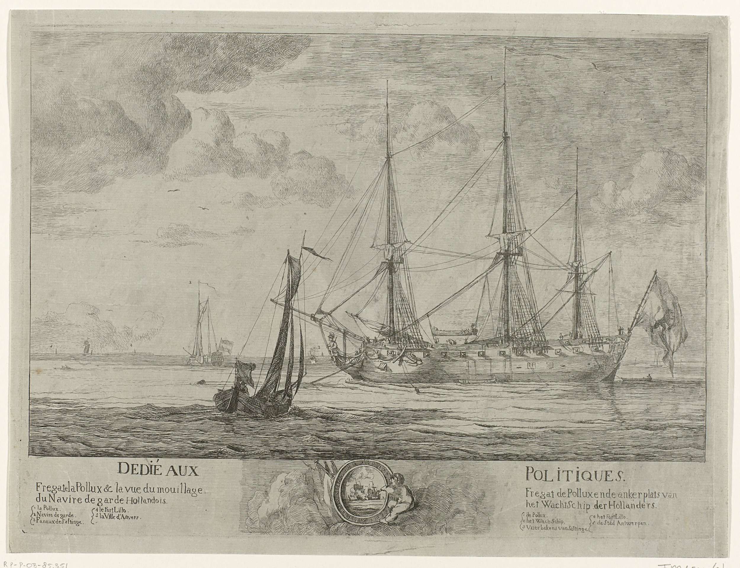 Rivierlandschap met het Nederlandse fegat Pollux voor anker in de Schelde bij het wachtschip na het incident waarbij de keizerlijke brik Louis zonder toestemming de Schelde was opgevaren op 8 oktober 1784. In de marge onder de voorstelling de titels, de opdracht "Dedié aux Politiques" en legenda's in het Frans en Nederlands aan weerszijden van ...