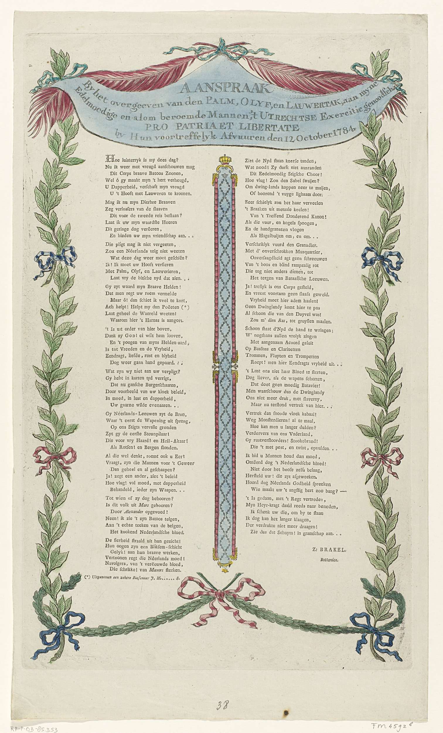 Vers ter gelegenheid van een schietoefening van het Utrechts Exercitiegeootschap Pro Patria et Libertate, 12 oktober 1784. Vers in twee kolommen binnen een kader van lauwertakken, palmtakken en olijftakken die met linten verbonden zijn.