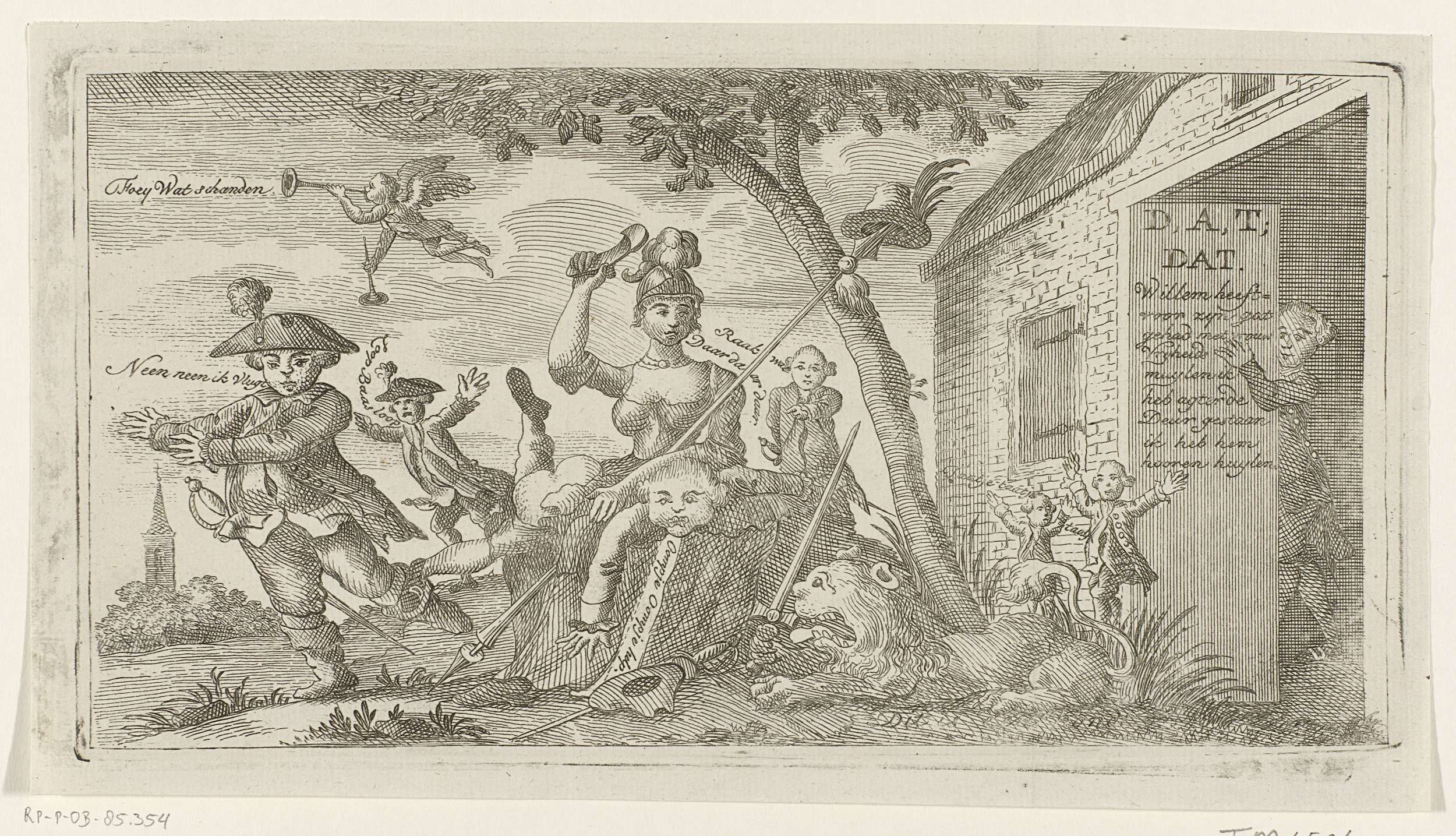 Spotprent op prins Willem V, 1784. Willem V ligt bij de Nederlandse Maagd op schoot en wordt door haar met een pantoffel op het ontblote achterwerk geslagen. De prins roept de hertog van Brunswijk om hulp maar deze vlucht. Rechts kijkt een toeschouwer glimlachend vanuit een stal toe, hierbij een versje.