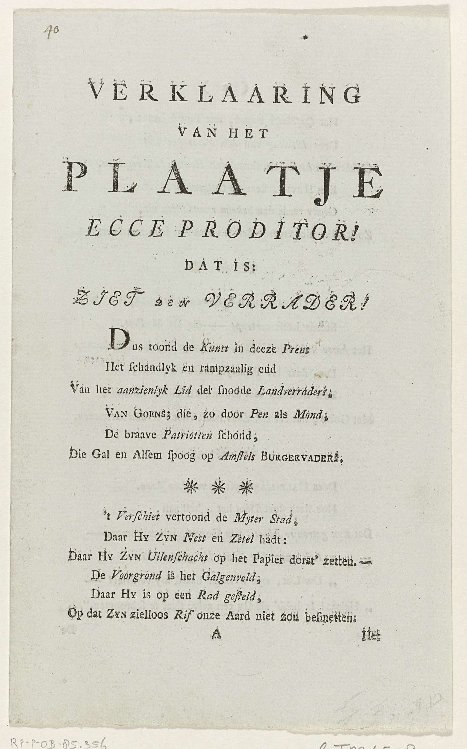 Tekstblad met een verklaring van de spotprent op de orangist Rijklof Michael van Goens, veroordeeld als landverrader op het rad, 1784. Dubbelgevouwen blad met een spotvers in negen coupletten op vier bladzijden.