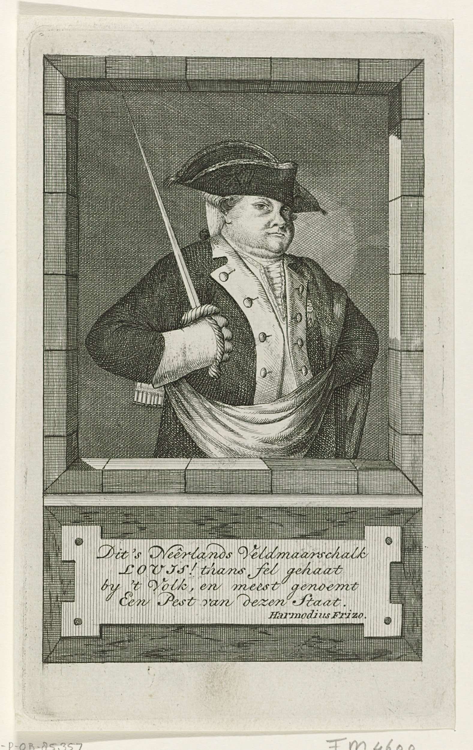 Spotprent op de hertog van Brunswijk, ca. 1782-1783. Portret ten halven lijve, staande met getrokken degen, binnen een stenen kader. Onder het portret een vierregelig vers. Bij de prent behoort een blad met spotverzen op het portret.