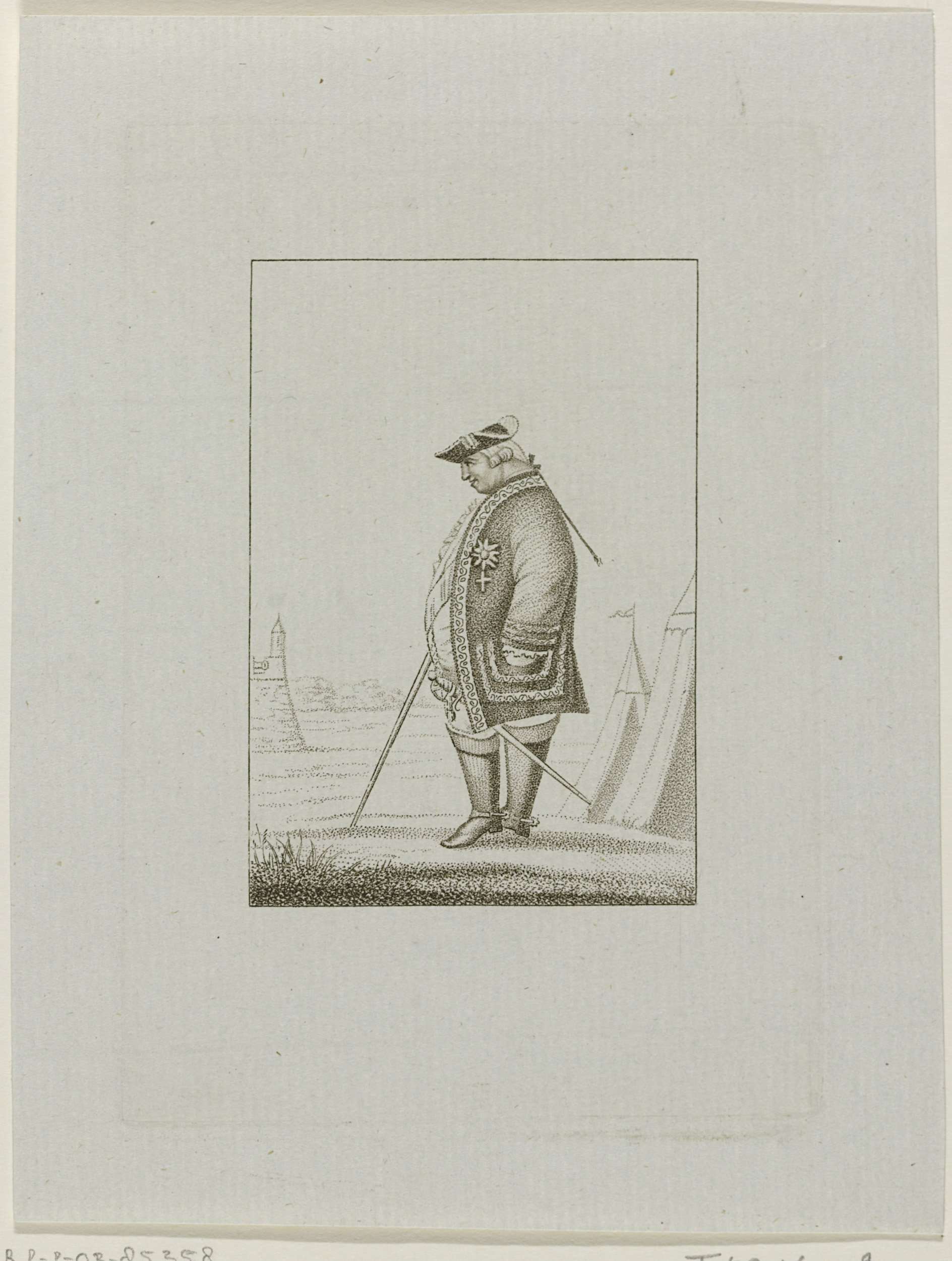 Portret van de hertog van Brunswijk, staande in veldmaarschalksuniform voor enkele legertenten, ca. 1784.