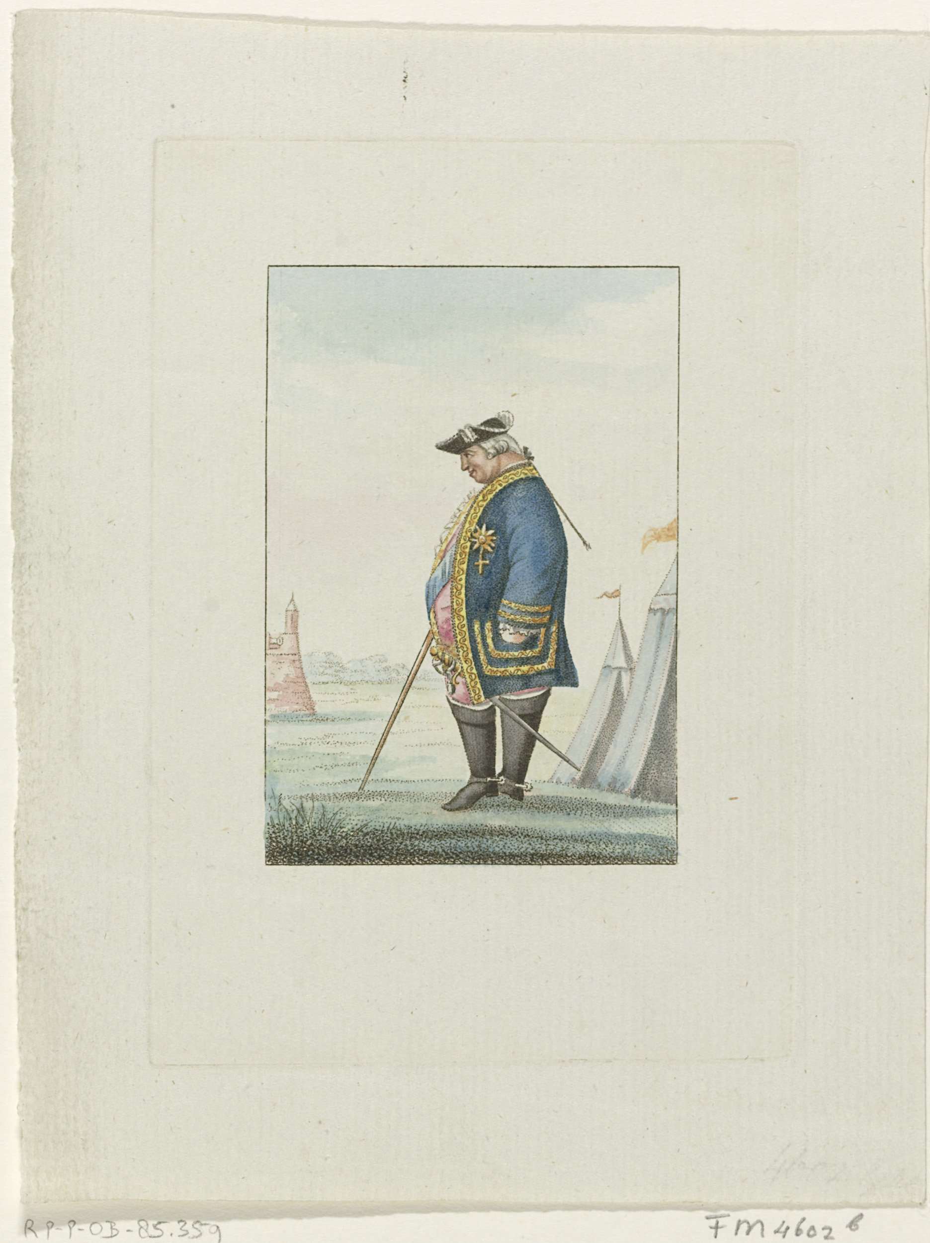 Portret van de hertog van Brunswijk, staande in veldmaarschalksuniform voor enkele legertenten, ca. 1784.