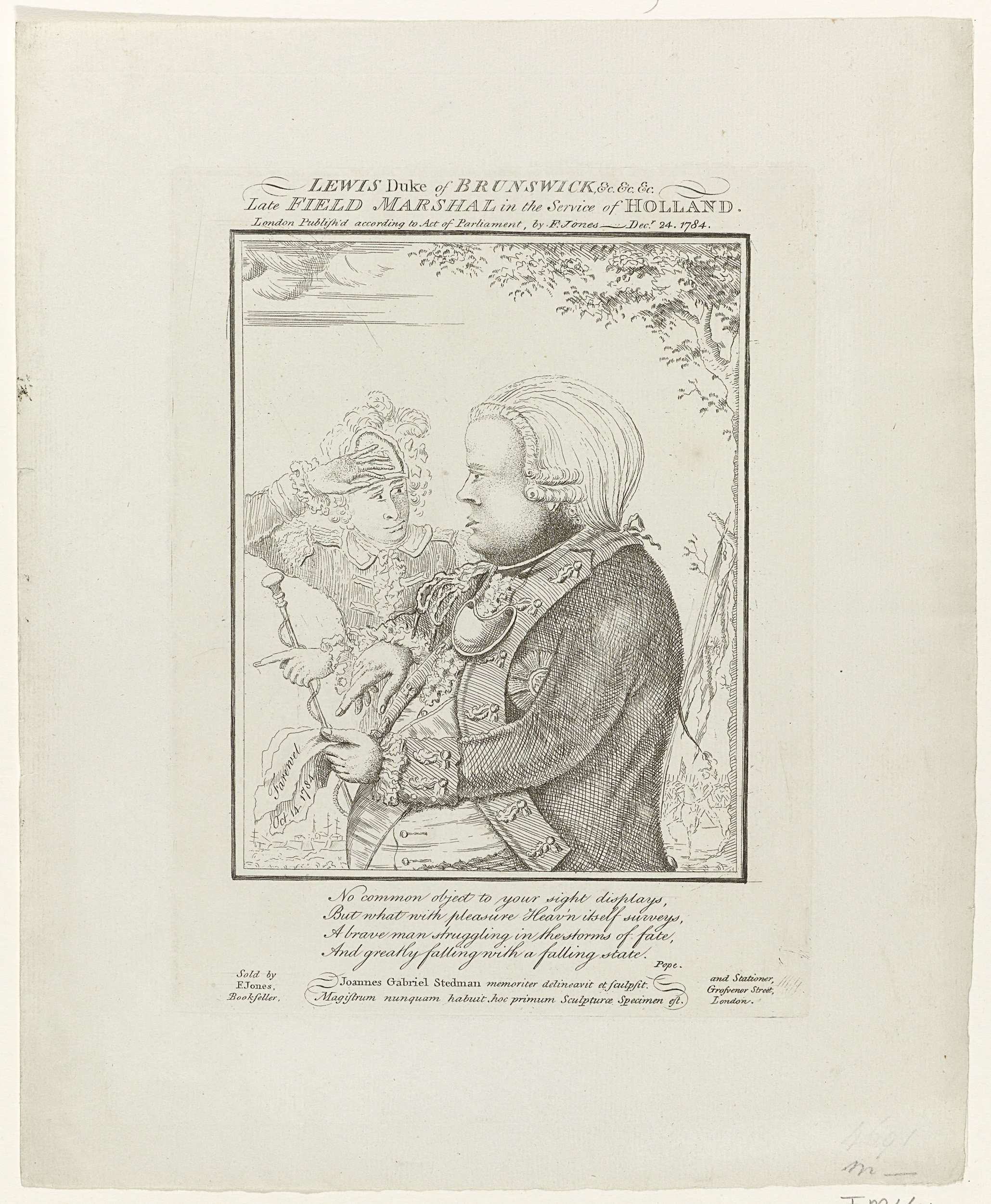 Spotprent op het vertrek van de hertog van Brunswijk uit Nederland, 14 oktober 1784. De hertog wordt door een militair gegroet, in zijn handen houdt hij een afscheidsbrief gedateerd Oct. 14 1784. In het onderschrift een vierregelig vers in het Engels.