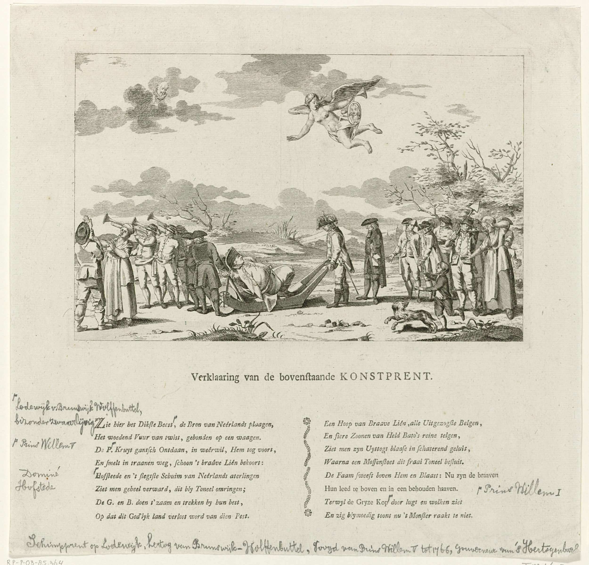 Spotprent op het vertrek van de hertog van Brunswijk uit Nederland, 14 oktober 1784. De dikke hertog wordt door prins Willem V op een kruiwagen het land uitgekruid. In het gevolg van de prins o.a. Kaat Mossel. Vanuit de wolken kijkt Van Oldenbarnevelt toe terwijl de Faam op haar bazuin blaast. Op het blad onder ...