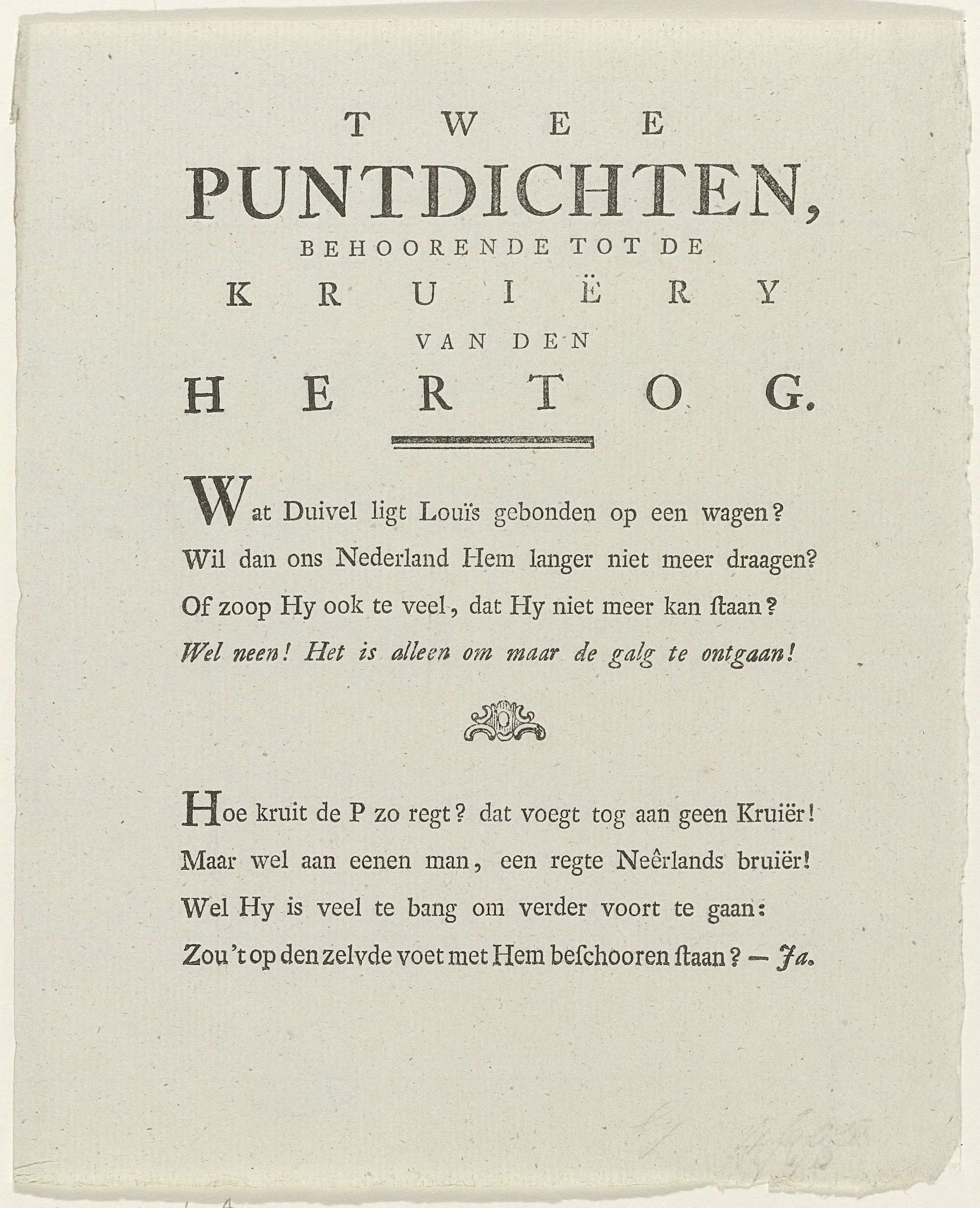 Twee puntdichten bij de spotprent met het wegkruien van de hertog van Brunswijk uit Nederland, 1784