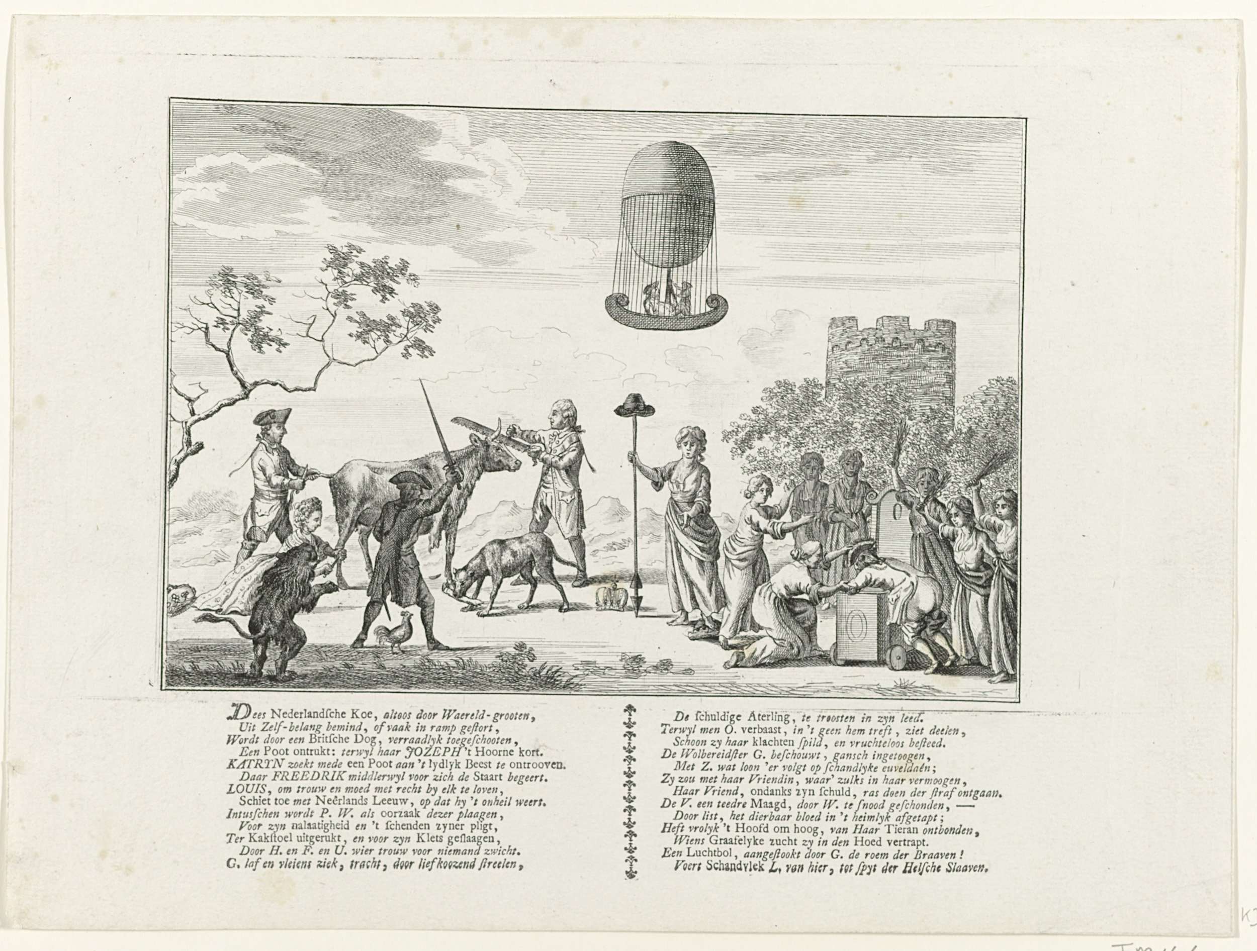 Spotprent op de beroerde politieke toestand van het land in 1784. De Nederlandse koe wordt door keizer Jozef II een horen afgezaagd terwijl een Engelsman, keizerin Catharina de Grote en koning Frederik van Pruisen ook delen van het dier proberen te bemachtigen. Ondertussen ontsnapt de hertog van Brunswijk uit Nederland in een luchtballon. Rechts is ...
