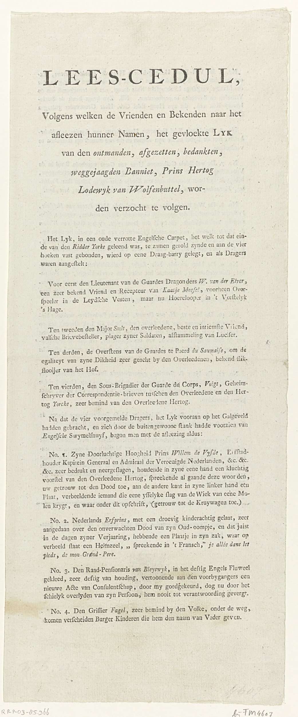 Gefingeerde lijst van namen van personen die deel uitmaken van de begrafenisstoet bij de begrafenis van de hertog van Brunswijk, 27 augustus 1784. Tekstblad bedrukt op beide zijden met namen onder de nummers 1-12.