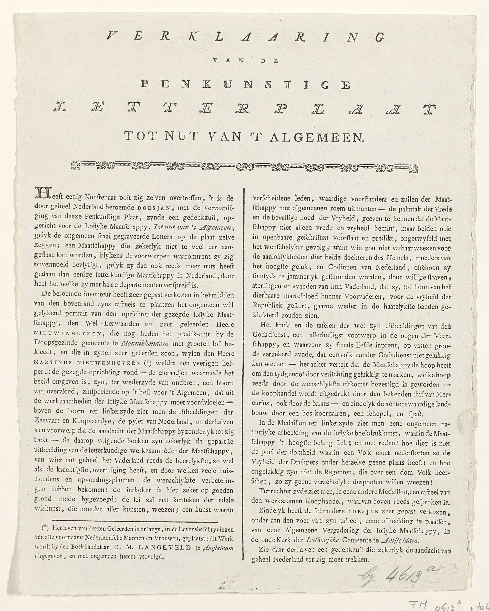 Tekstblad met een verklaring van de kalligrafische voorstelling naar aanleiding van de oprichting van de Maatschappij tot Nut van 't Algemeen op 16 november 1784. De tekst vermeldt het overlijden van Martinus Nieuwenhuyzen (maart 1793).