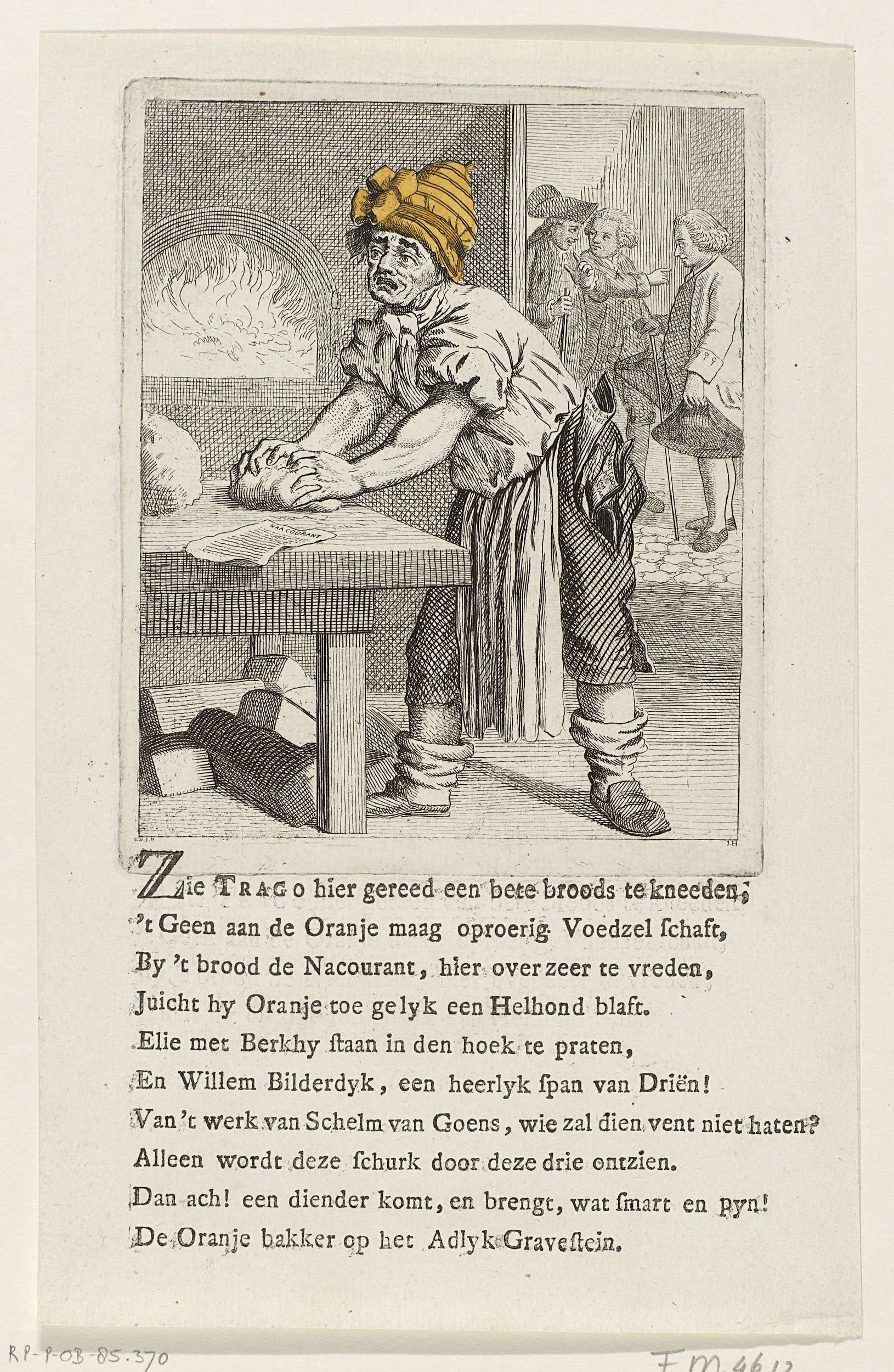Spotprent op de oranjegezinde Leidse bakker Adriaan Trago, 1784. Trago kneedt het brooddeeg met een oranje muts op zijn hoofd. Op de achtergrond praten met elkaar Luzac, Bilderdijk en Berkhey. Op het blad onder de plaat een tienregelig vers.