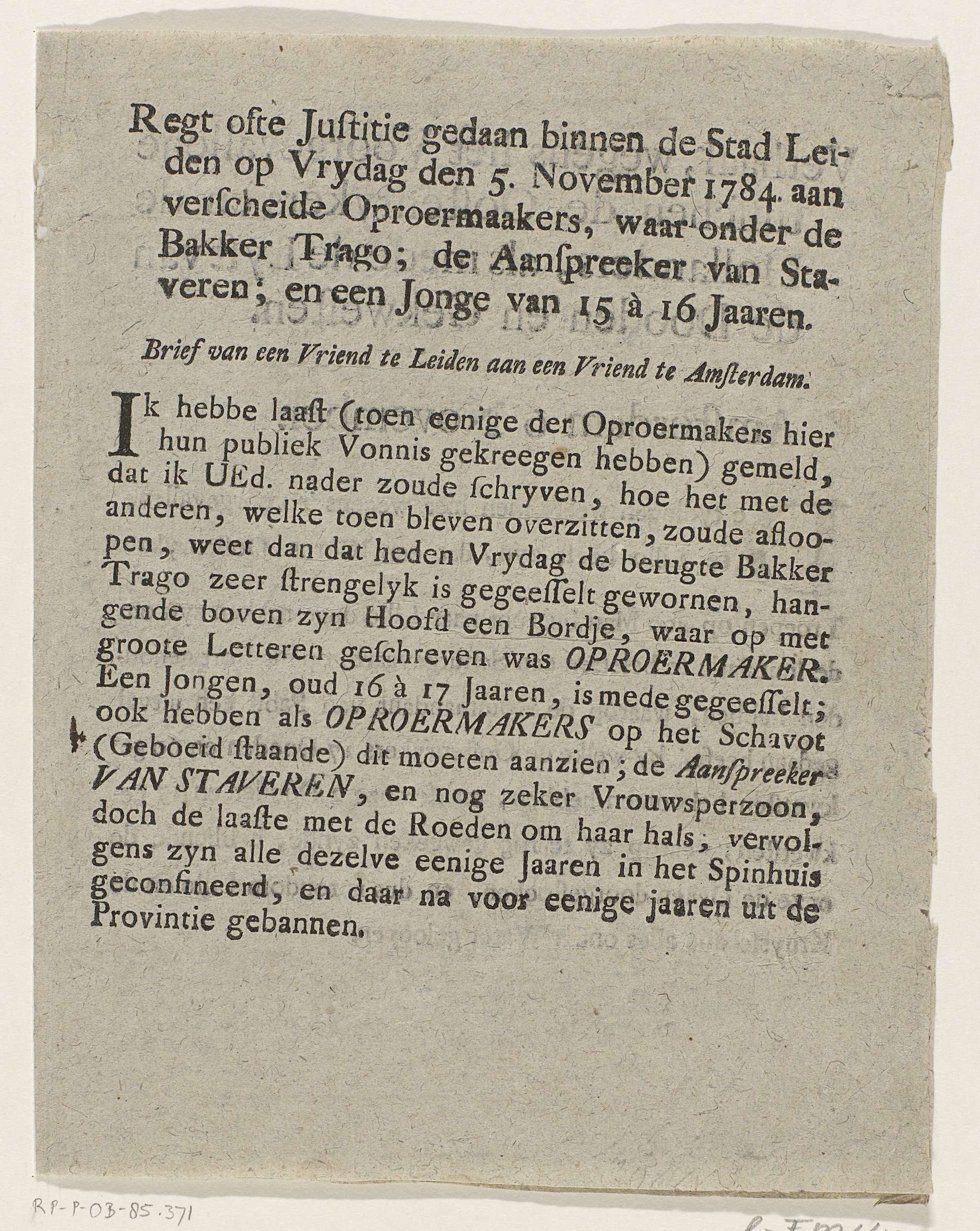 Tekstblad met een brief over de openbare geseling van de oranjegezinde Leidse bakker Adriaan Trago en verscheidene andere oproerkraaiers te Leiden op 5 november 1784. Dubbelgevouwen blad met op de voorzijde dit bericht, op de andere zijden staat een ander verhaal met lied.