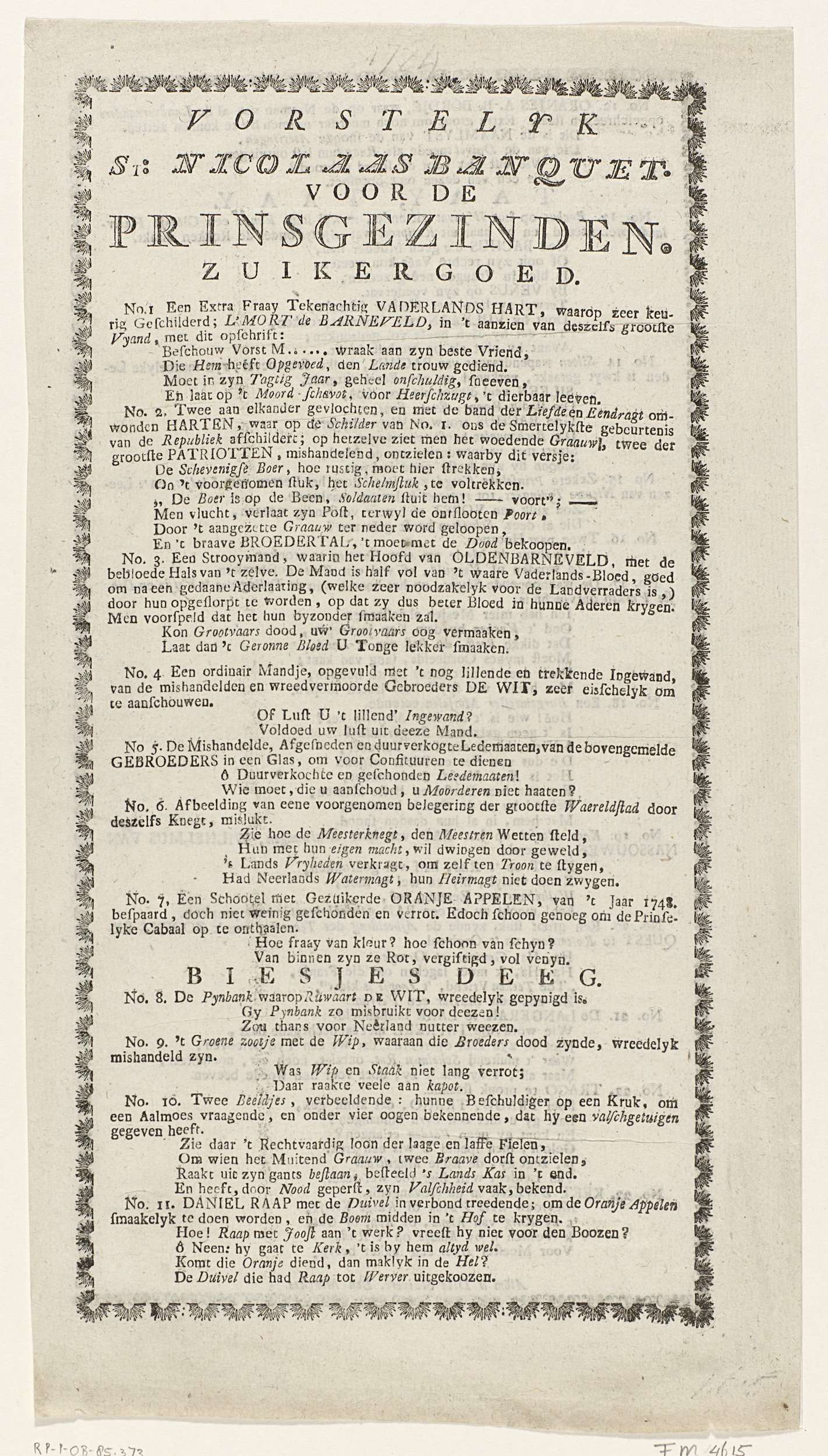 Tekstblad met op beide zijden een patriots spotvers in 23 refreinen met recepten voor prinsgezinde koeken en suikergoed. Met verwijzingen naar de terechtstelling van Johan van Oldenbarnevelt en de moord op de gebroeders de Witt.