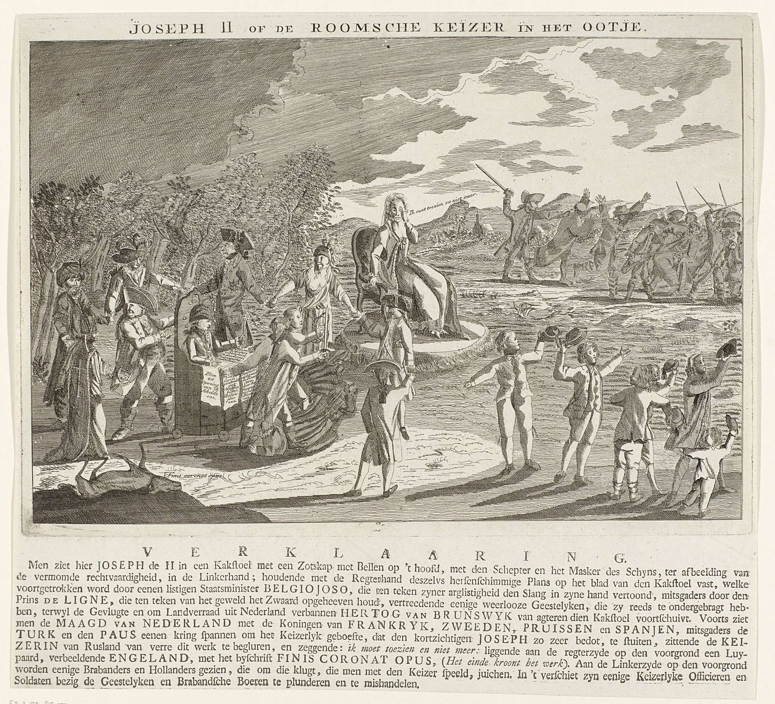 Spotprent op de Duitse keizer Jozef II, 1785. De keizer in een rolstoel (kinderstoel of kakstoel) voortgeduwd door de hertog van Brunswijk. Op de stoel documenten met plannen van de keizer. Om de stoel dansen de Nederlandse Maagd, de koningen van Frankrijk, Zweden, Pruisen en Spanje, de Turk en de Paus. Keizerin Catharina de Grote ...