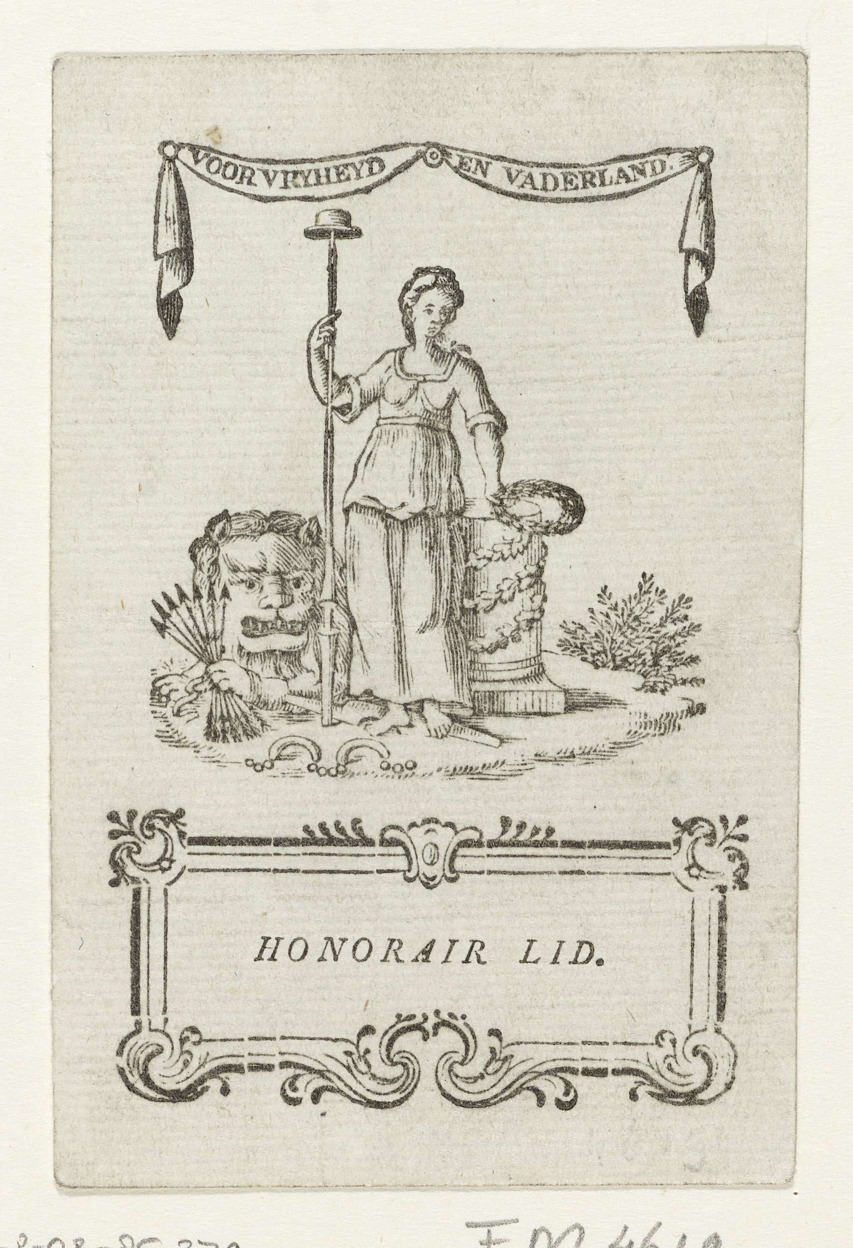 Lidmaatschapsbewijs voor het Leidse Genootschap Voor Vrijheid en Vaderland. Vignet met de Nederlandse Vrijheid met lans en hoed, Nederlandse leeuw en altaar. Daaronder cartouche met: Honorair Lid.