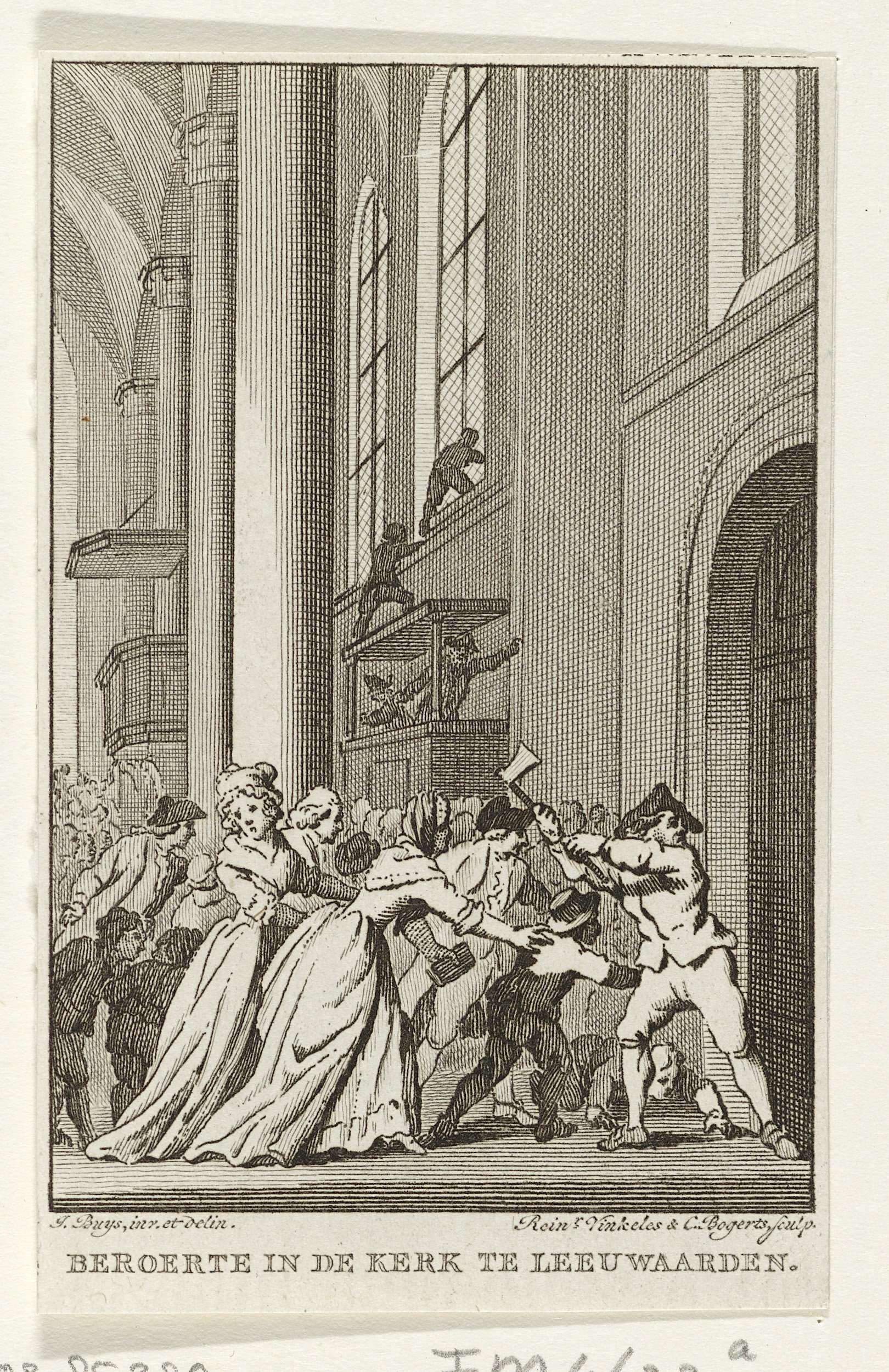 Paniek onder de kerkgangers in de Grote Kerk te Leeuwarden, 26 januari 1785. Bij pogingen van het publiek om uit de kerkzaal te komen worden vier mensen vertrapt, een man hakt met een bijl de deur open.