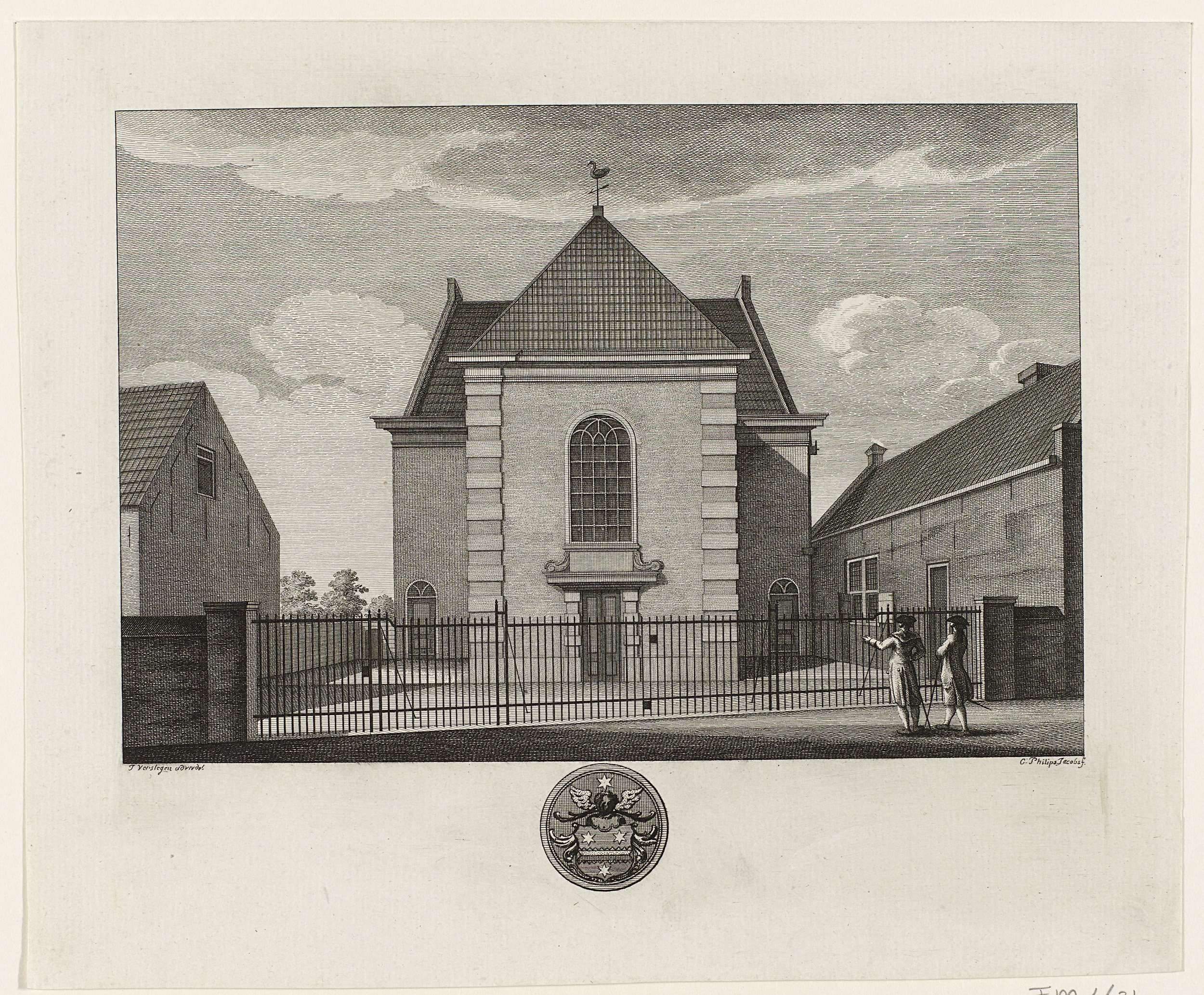 De Lutherse kerk te Beverwijk, verkocht in 1785 aan de Amsterdammer Joan Coenraad Brandt. Onderaan een medaillon met wapen.