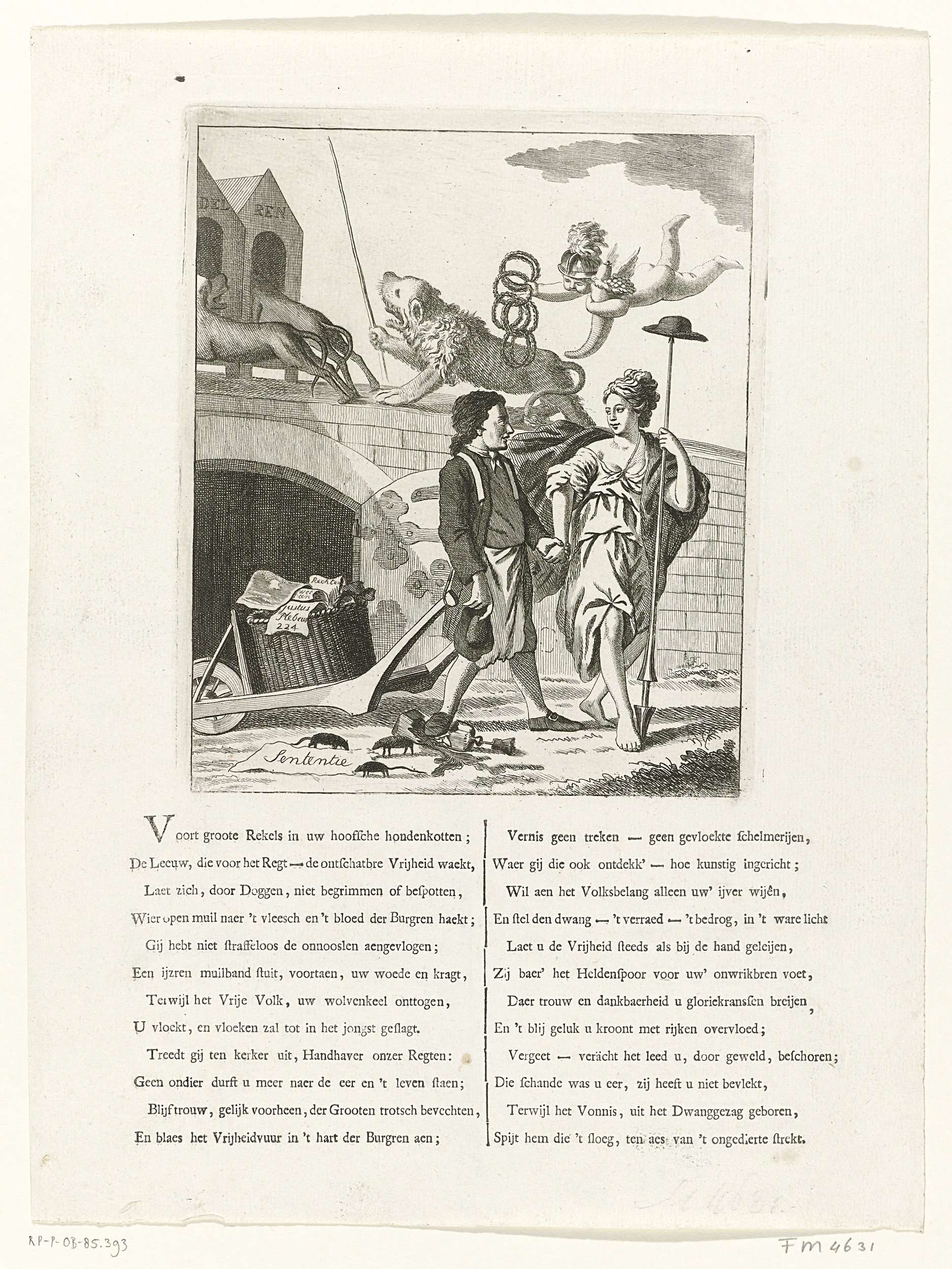 Spotprent op de rechtszaak aangespannen op 16 april 1785 door de twee Amsterdamse burgemeesters J. Rendorp en W.G. Dedel tegen J.C. Hespe en J. Verlem, schrijver en uitgever het patriottisch weekblad De Politieke Kruier, en de vrijspraak van Hespe uitgesproken op 19 mei. De kruier wordt door de Vrijheid uit de gevangenis geleid, de Nederlandse ...
