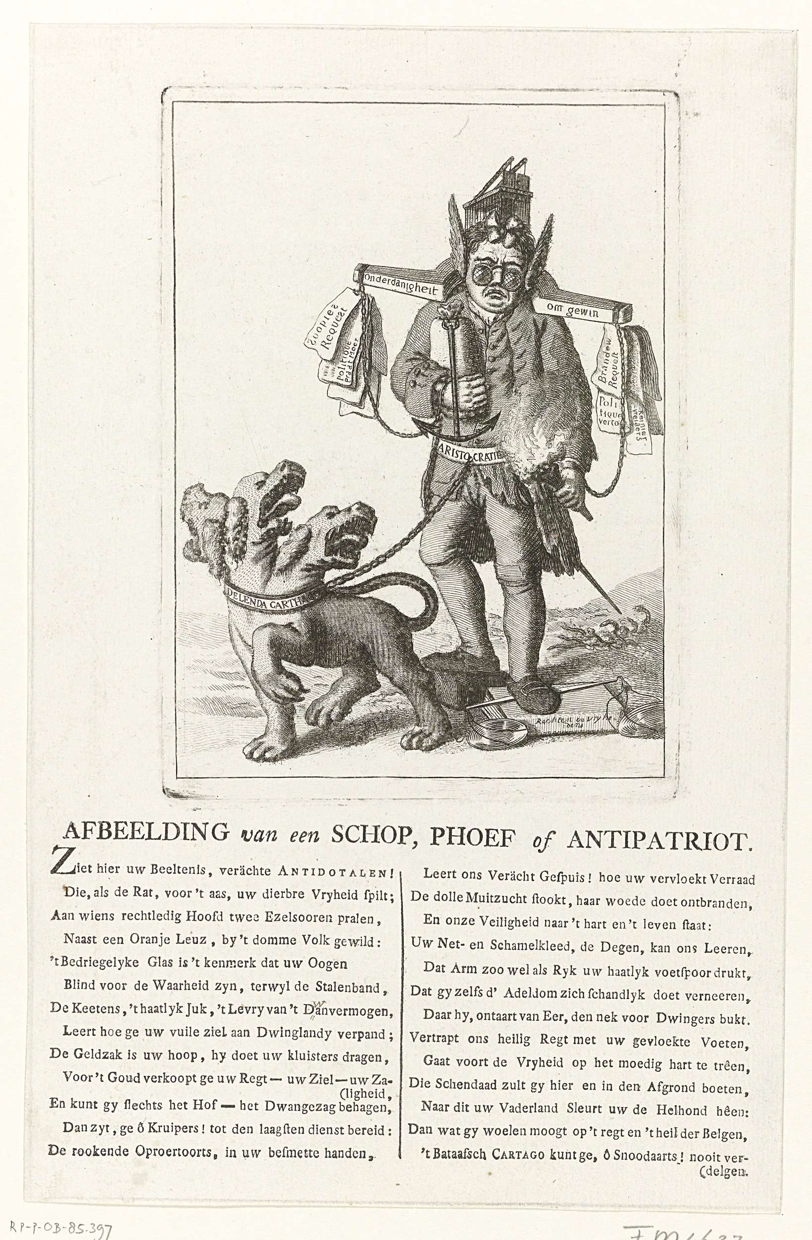 Patriots spotprent op de prinsgezinde ondertekenaars van het Brandewijn Request of Request Anti-dotaal (rekest antidotaal) te Rotterdam op 10 juni 1785. Man met muizenval op het hoofd, grote bril, ezelsoren, juk op de schouders waaraan allerlei Orangistische pamfletten, brandende toorts in de hand, weegschalen van justitie onder de voet vertredend en met driekoppige hond aan ...