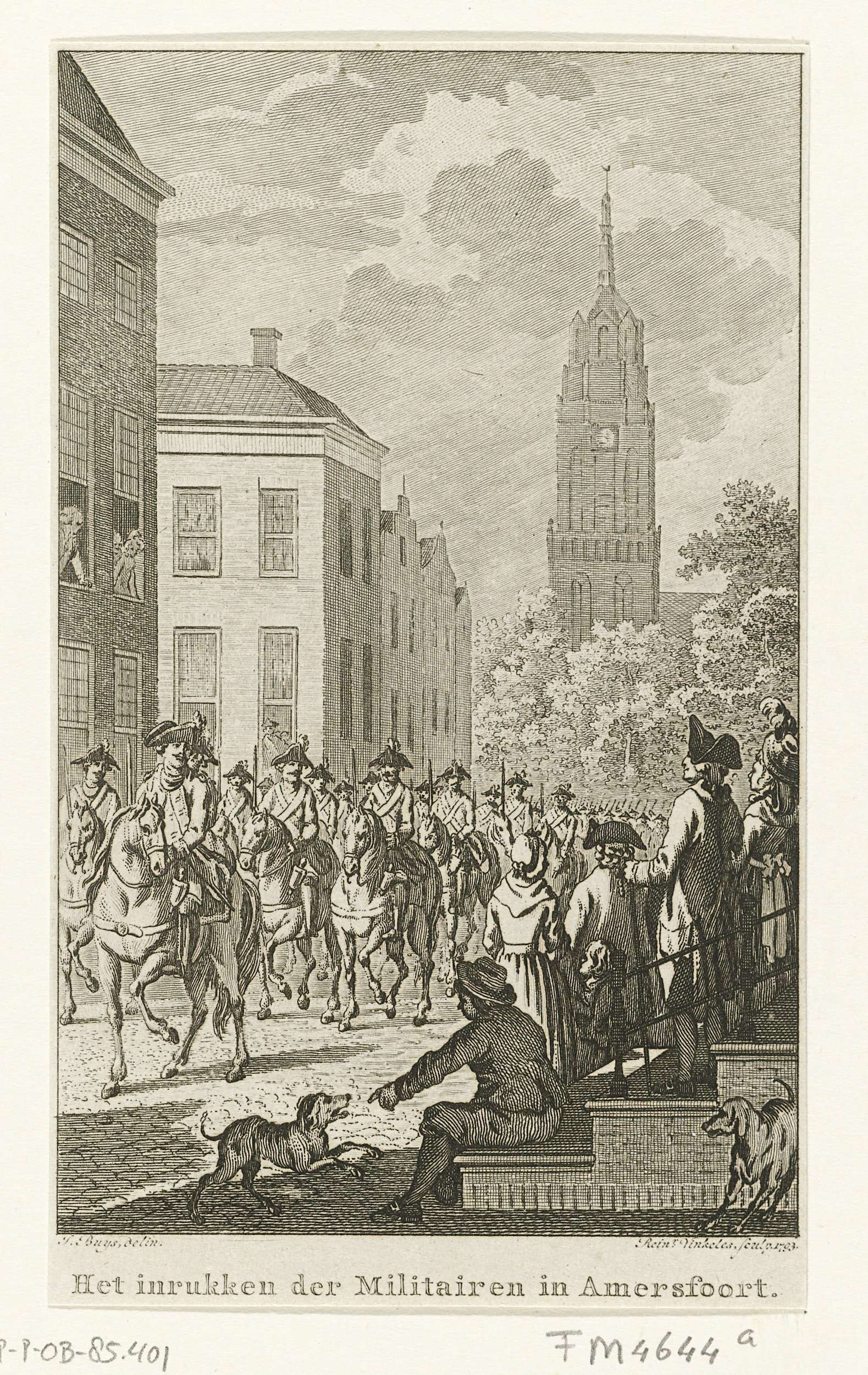 Op last van prins Willem V en op verzoek van de Gedeputeerde Staten van Utrecht worden de militairen ingerukt, 16 augustus 1785. Soldaten te paard trekken door een straat te Amersfoort.