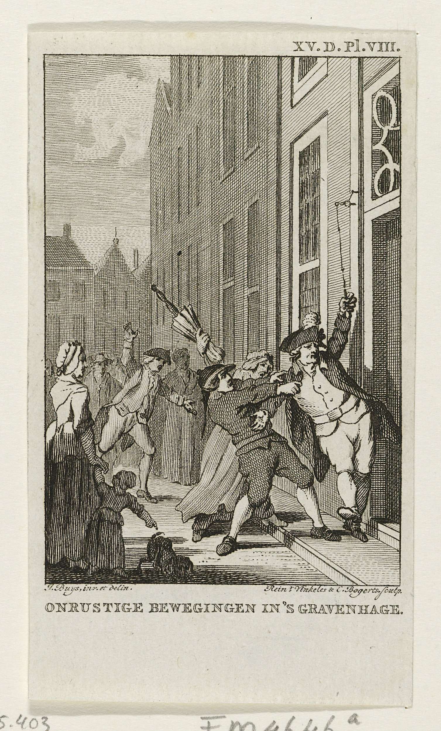 Onrust onder Oranjegezinden in Den Haag, 4 september 1785. Worsteling op straat bij de voordeur van een woning.