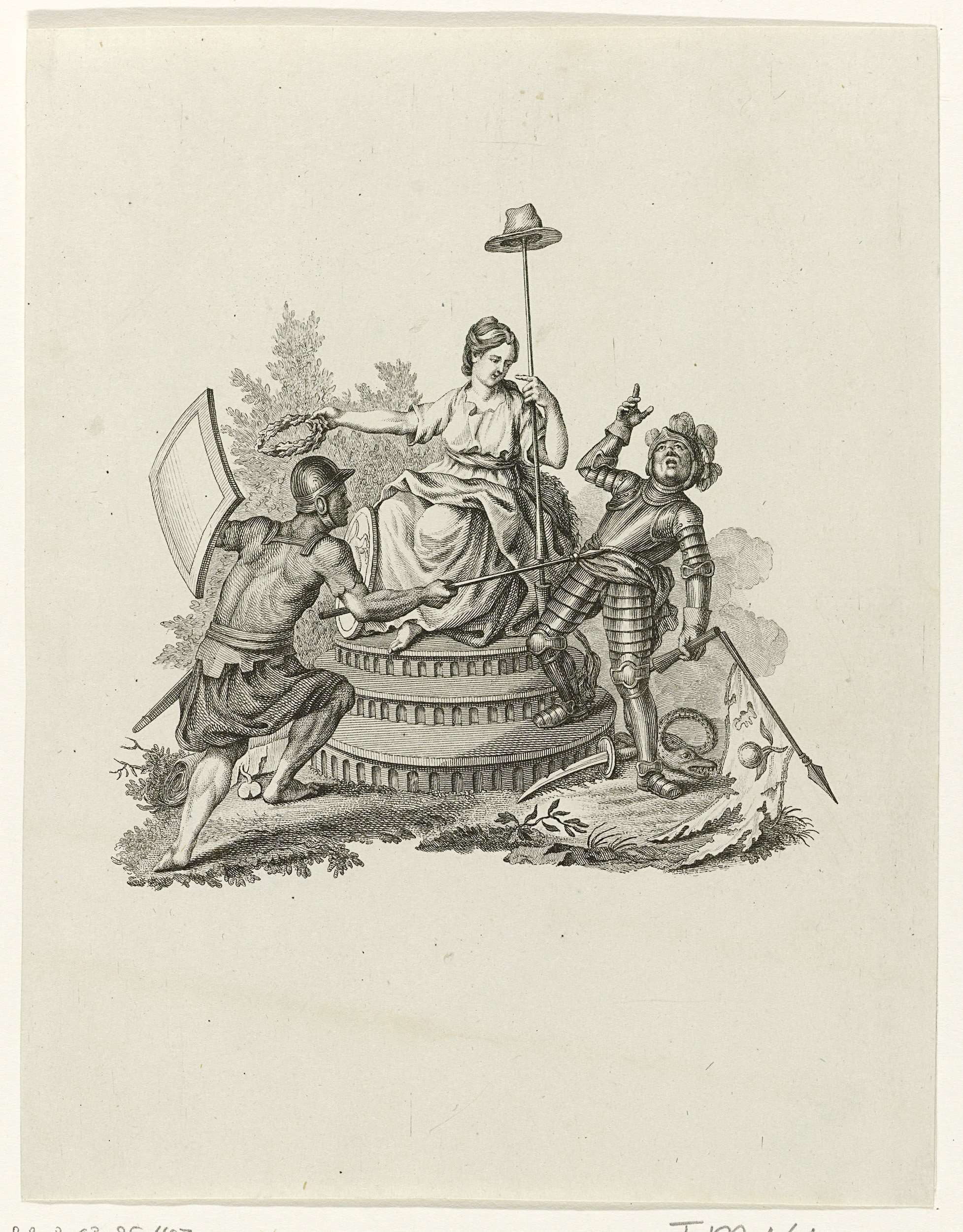 Titelpagina voor: De Politieke Kruyer, dl. 2, 1784. Allegorie waarin onder het goedkeurende toezicht van de Nederlandse Vrijheid een gewapende burger een geharnste ridder met gebroken vaandel met oranjeappel belet de vrijheidstroon te betreden.