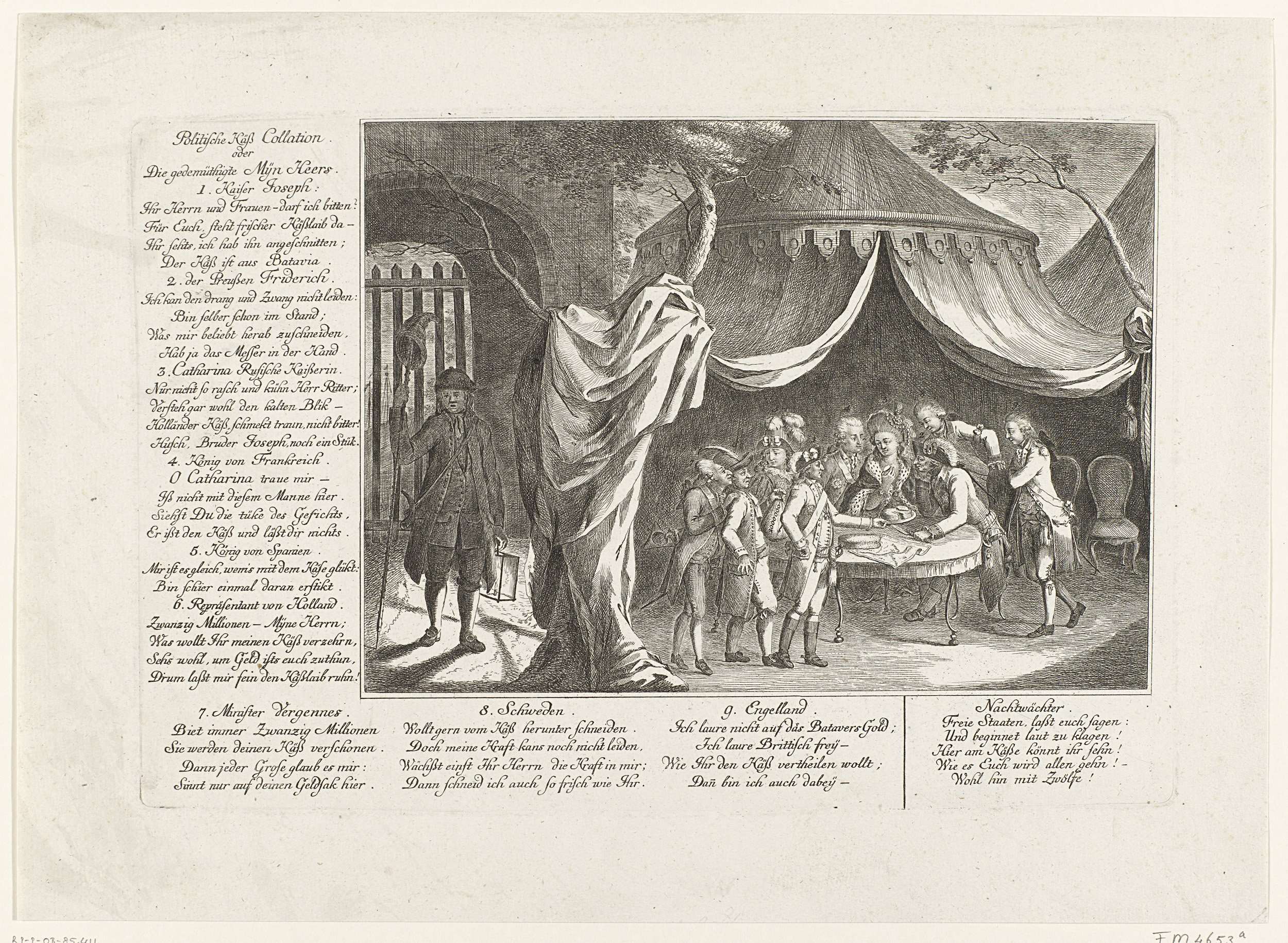 Spotprent op de vrede gesloten te Parijs waarmee een eind kwam aan de Keteloorlog, de twisten tussen Nederland en de Oostenrijkse keizer Jozef II, 8 november 1785. Nederland betaalde 8,5 miljoen gulden en accepteerde andere vernederende voorwaarden. In een tent verdeelt keizer Jozef een Hollandse kaas onder Frederik van Pruisen, Catharina de Grote, Lodewijk XVI ...