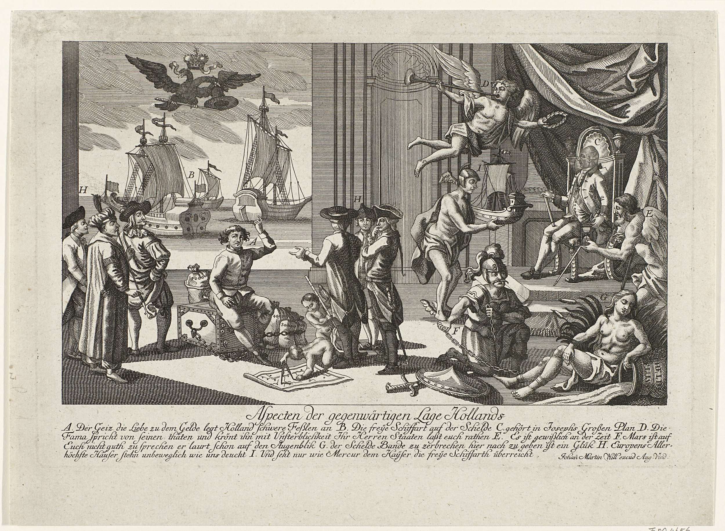 Spotprent op de vrede gesloten te Parijs waarmee een eind kwam aan de Keteloorlog, de twisten tussen Nederland en de Oostenrijkse keizer Jozef II, 8 november 1785. Nederland betaalde 8,5 miljoen gulden en accepteerde andere vernederende voorwaarden. De Nederlander zit geketend op een geldkist, rechts aanvaardt keizer Jozef II op zijn troon een schip van ...