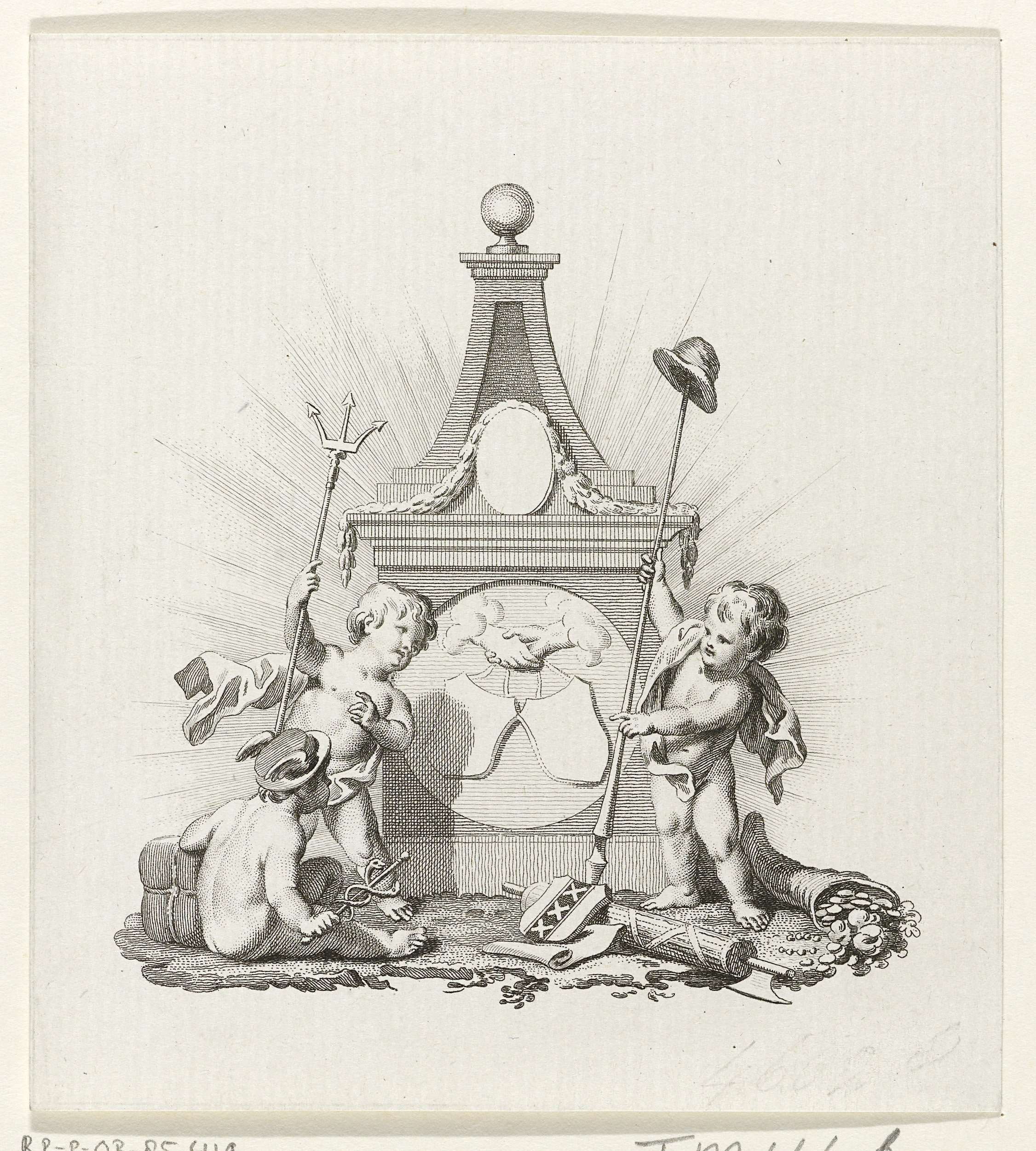 Titelpagina voor: Nederland in verbond met Frankrijk. 10 november 1785. Allegorisch vignet met geniussen bij een monument voor het verbond tussen de twee landen.