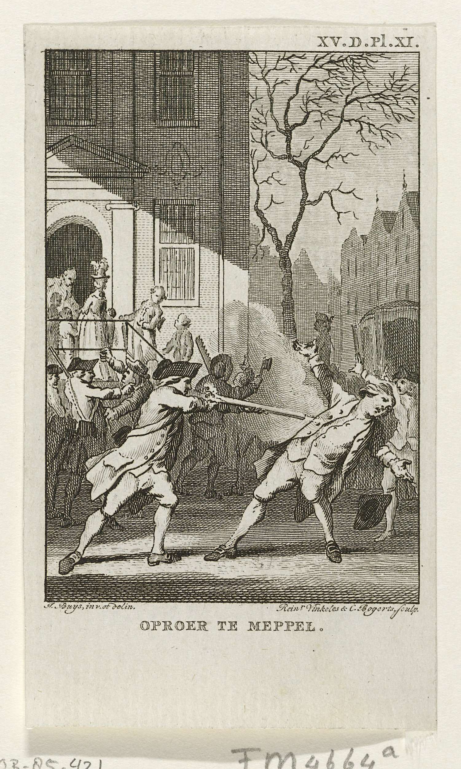Ongeregeldheden te Meppel, 11 november 1785. Een man wordt op straat neergeschoten.