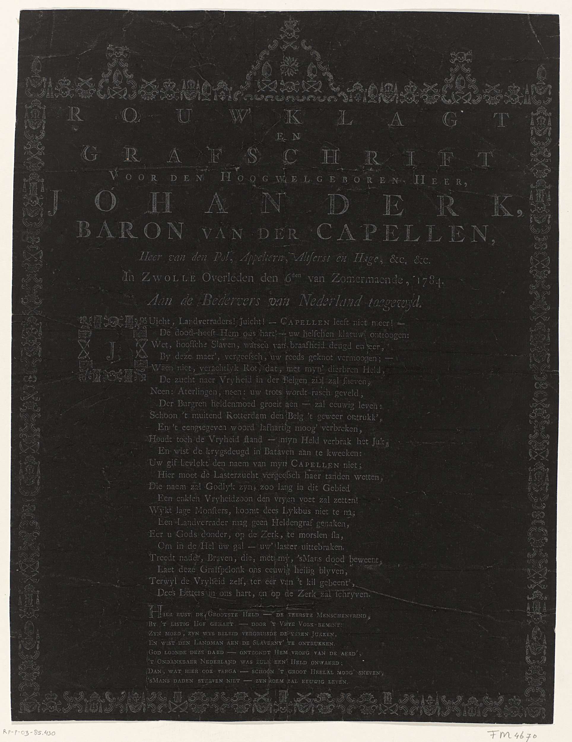 Grafschrift voor de in 1784 overleden Joan Derk van der Capellen tot den Pol, gedrukt in wit op een zwart blad, met een patriotse vers gericht tegen de bedervers van Nederland, de oranjegezinden, 1784-1785. Binnen een ornamentale rand van fileten.