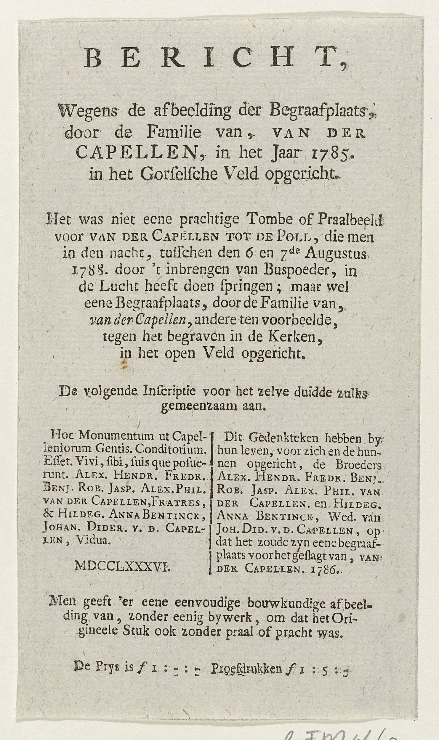 Tekstblad met een bericht van de uitgever over de publicatie van de prent met de architectonische voorstelling van de begraafplaats van de familie Van der Capellen in het Gorsselse Veld bij Zutphen, gebouwd in 1785 ter ere van de in 1784 overleden Joan Derk van der Capellen tot den Pol en in augustus 1788 door ...