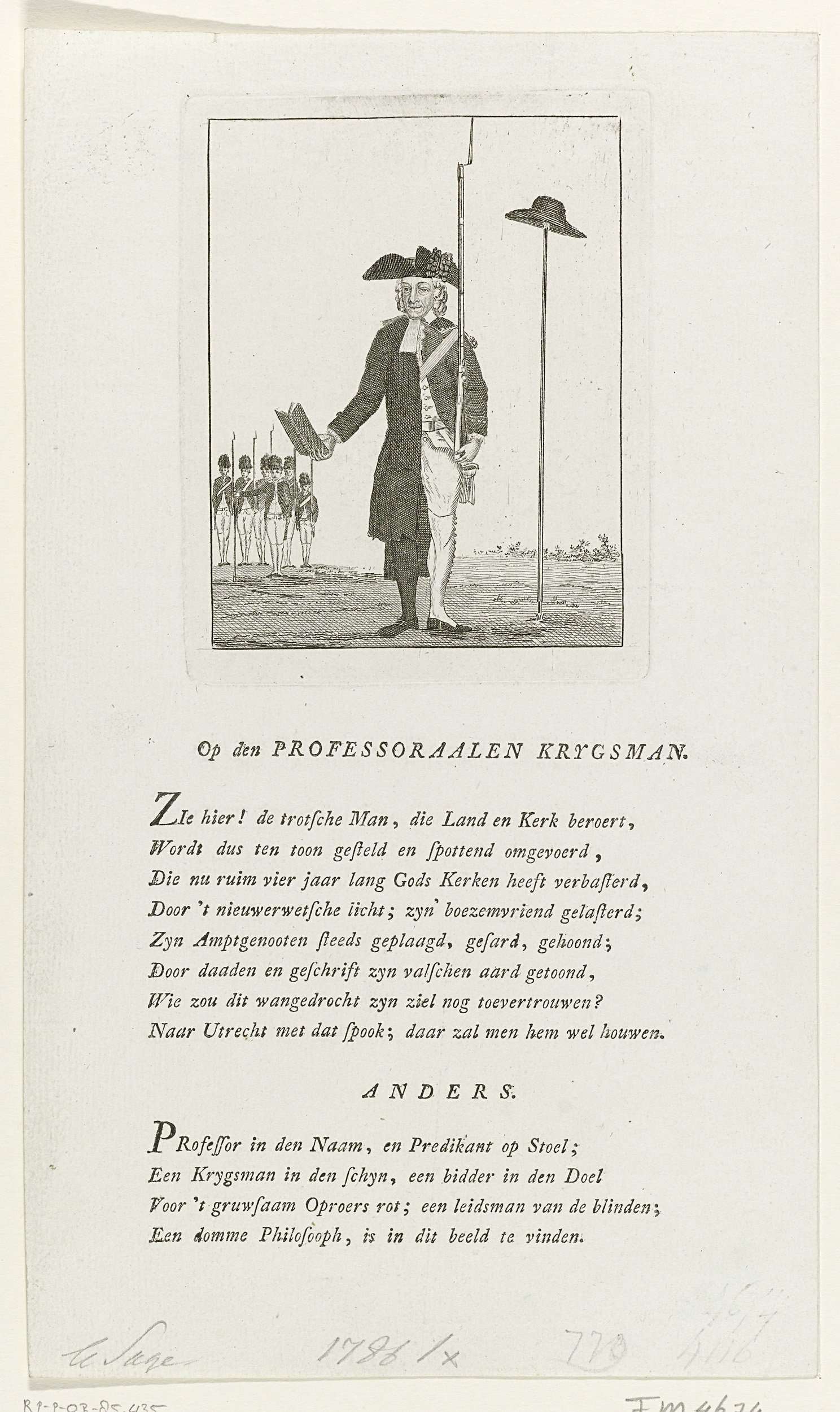 Spotprent op de Rotterdamse patriotse predikant en professor Johan Jacob le Sage ten Broek, ca. 1785. Ten Broek voorgesteld voor de ene helft als lid van een vrijkorps in uniform met geweer en voor de andere helft als een predikant met een bijbel in de hand. Naast hem een lans met vrijheidshoed. Op de achtergrond ...