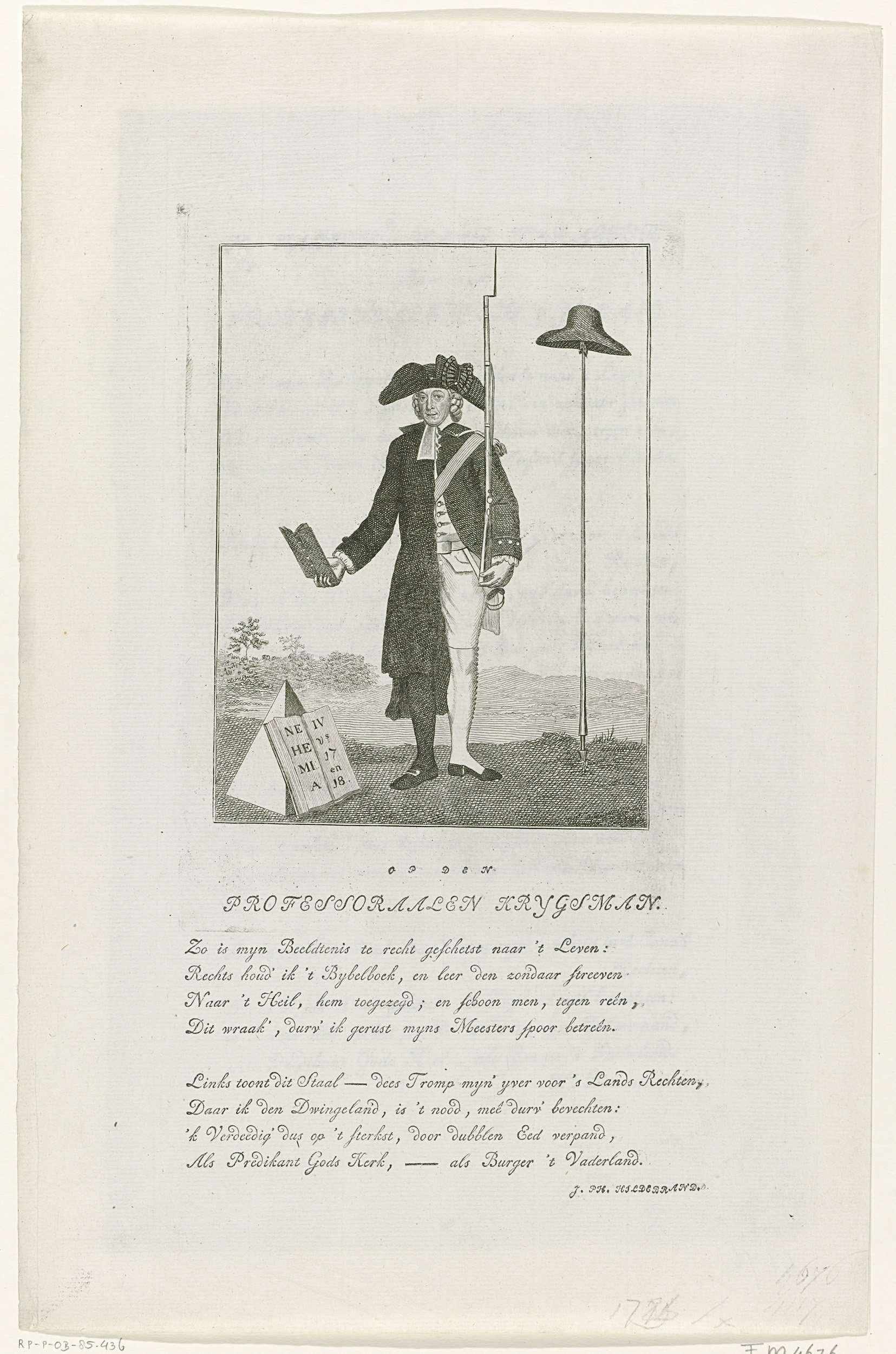 Voorstelling ter ere van de Rotterdamse patriotse predikant en professor Johan Jacob le Sage ten Broek, ca. 1785. Ten Broek voorgesteld voor de ene helft als lid van een vrijkorps in uniform met geweer en voor de andere helft als een predikant met een bijbel in de hand. Naast hem een lans met vrijheidshoed. Op ...