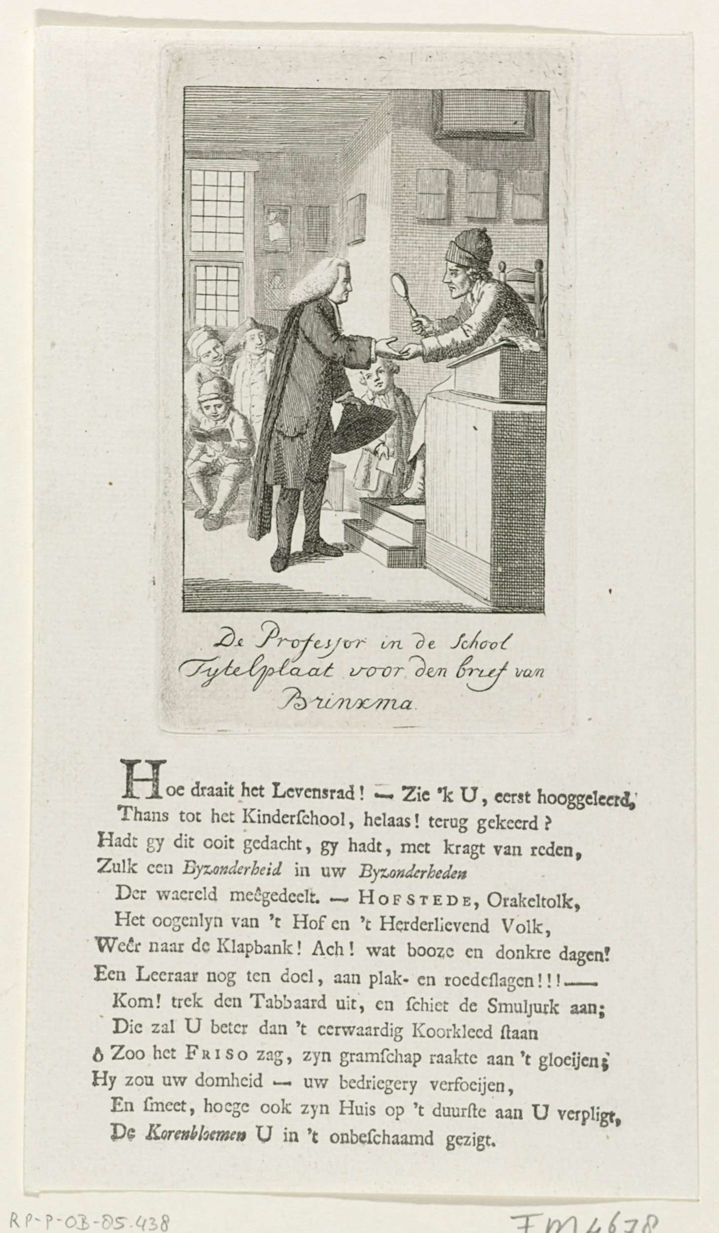 Spotprent op de Rotterdamse oranjegezinde predikant en professor Petrus Hofstede, 1785. Hofstede als een leerling die van de schoolmeester straf krijgt. Naar aanleiding van Brinxma's uitgegeven brief tegen Hofstede en zijn publicaties "Apologie" (1785) en "Bloemen gestrooid op het graf van Friso" (1752). Op het blad onder de plaat een vers van 14 regels.