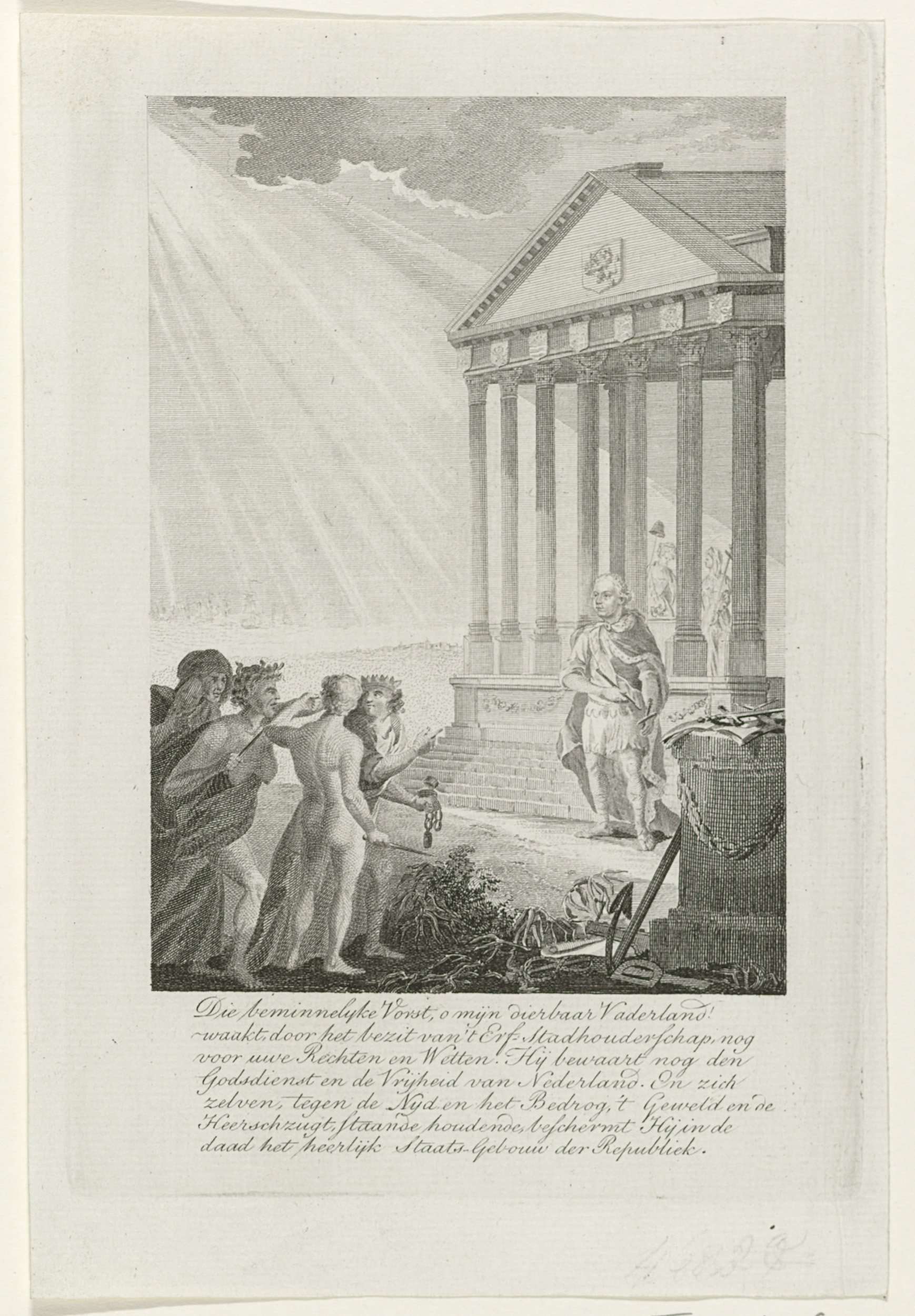 Titelpagina voor het oranjegezinde werk: Katechismus van het stadhouderschap, 1786. Voor een tempel met zeven pilaren in het stralende zonnelicht staat prins Willem V. Als beschermer van het Staatsgebouw van het Nederlandse Gemenebest verdedigt het erfstadhouderschap in de persoon van de stadhouder het land tegen de aanvallen van Nijd, Bedrog, Geweld en Heerszucht. In de ...