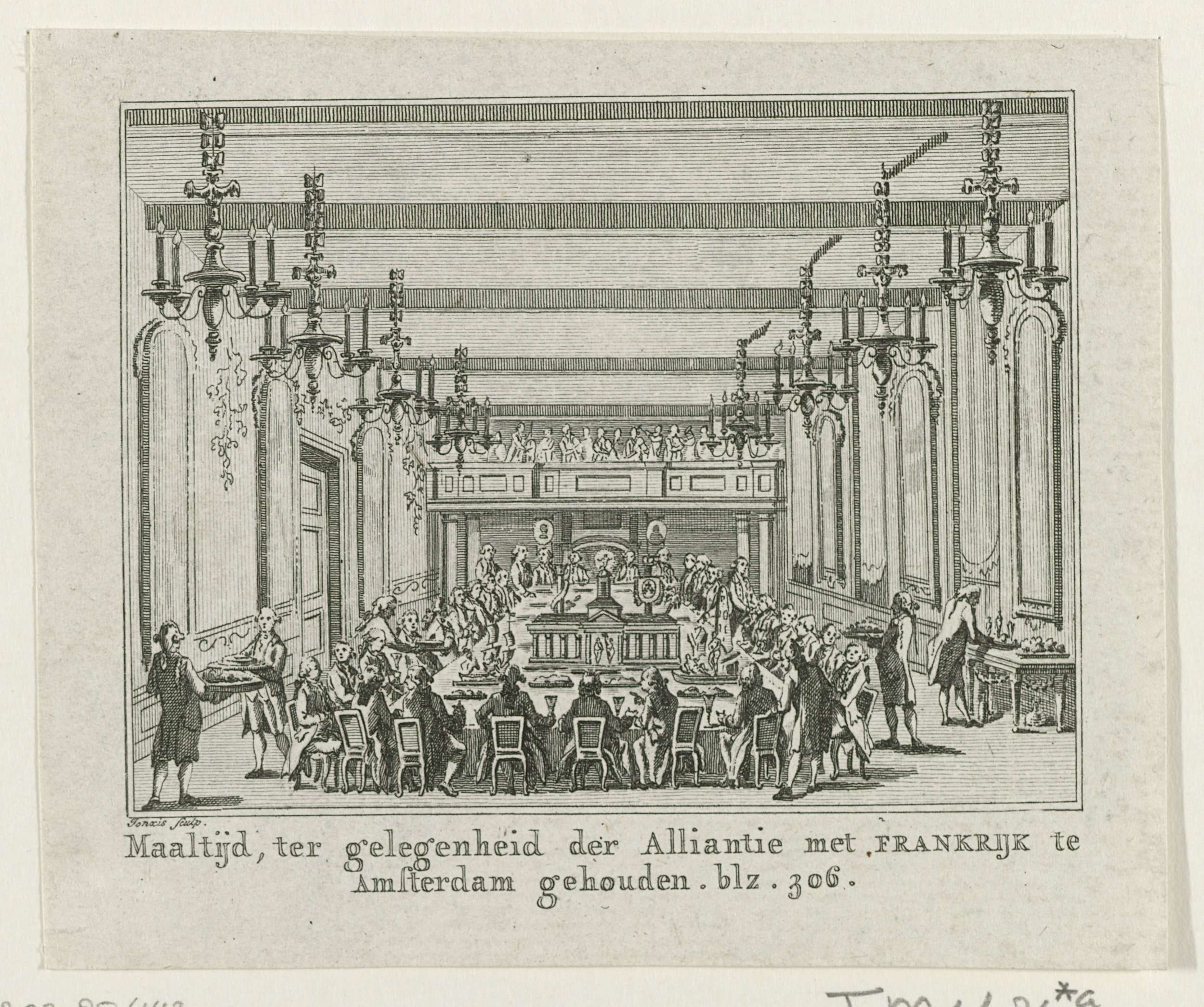 De feestelijke maaltijd gehouden op 27 januari 1786 in de Garnalen Doelen (Handboogdoelen) te Amsterdam om de Alliantie met Frankrijk (gesloten op 10 november 1785) te vieren. Groot gezelschap gezeten aan een tafel versierd met tafelstukken.