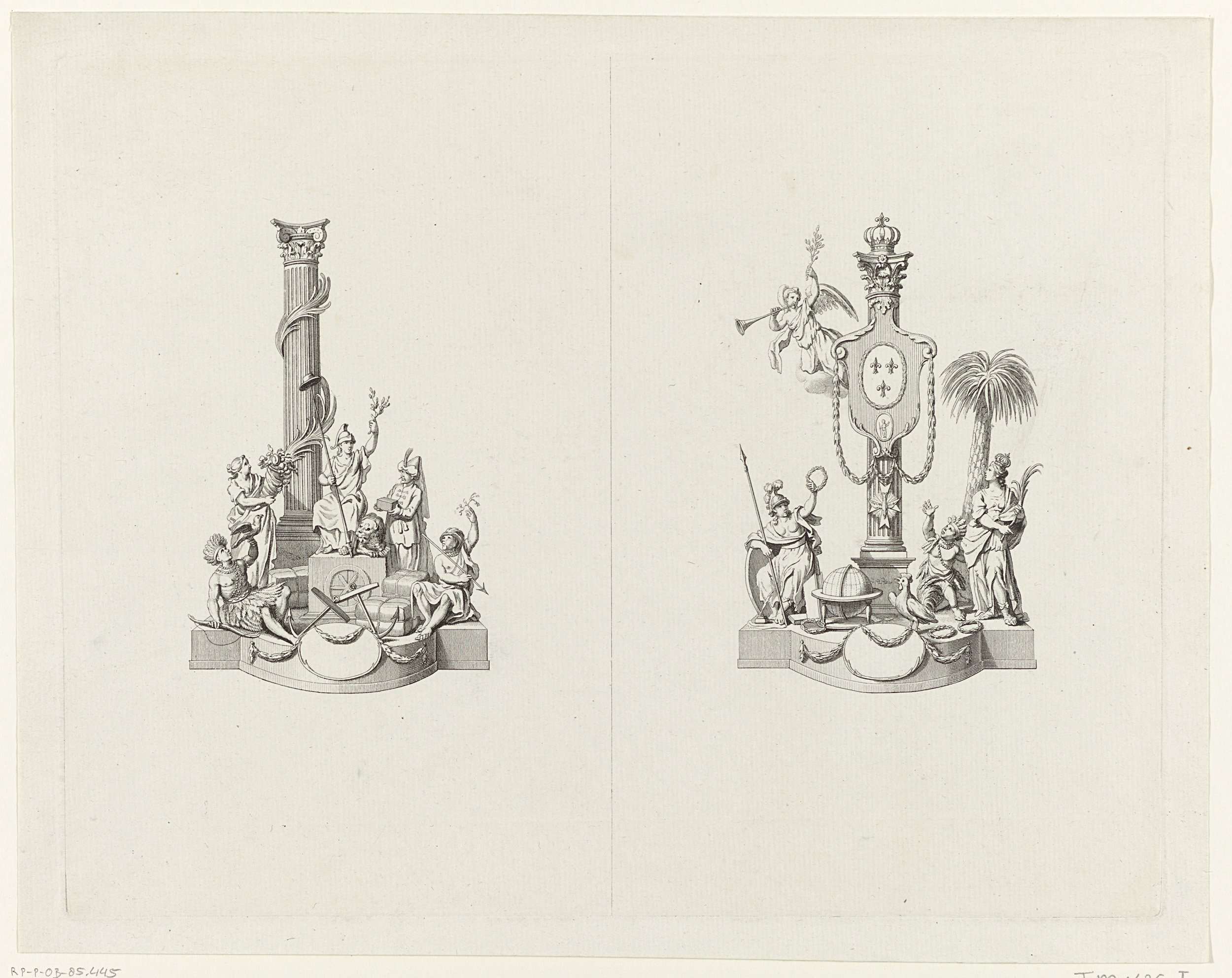 Blad met twee allegorische tafelversieringen (milieu de table) gebruikt bij de feestelijke maaltijd gehouden op 27 januari 1786 te Amsterdam om de Alliantie met Frankrijk te vieren. Links "Nederlands Groei en Bloei": de Nederlandse Maagd gezeten voor een zuil omringd door allegorische figuren. Rechts "Vrankrijks Voorspoed": een zuil met het Franse wapen omringd door allegorische ...