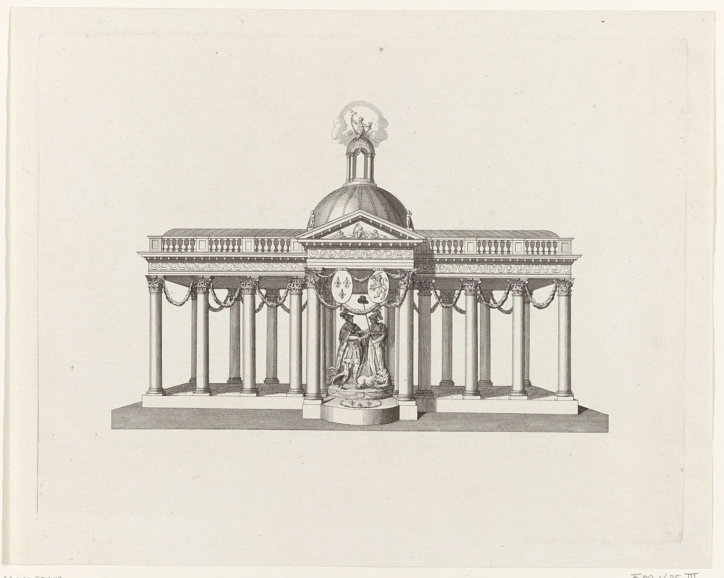 Een allegorische tafelversiering (milieu de table) gebruikt bij de feestelijke maaltijd gehouden op 27 januari 1786 te Amsterdam om de Alliantie met Frankrijk te vieren. Tempel met Frankrijk en de Nederlandse Maagd.