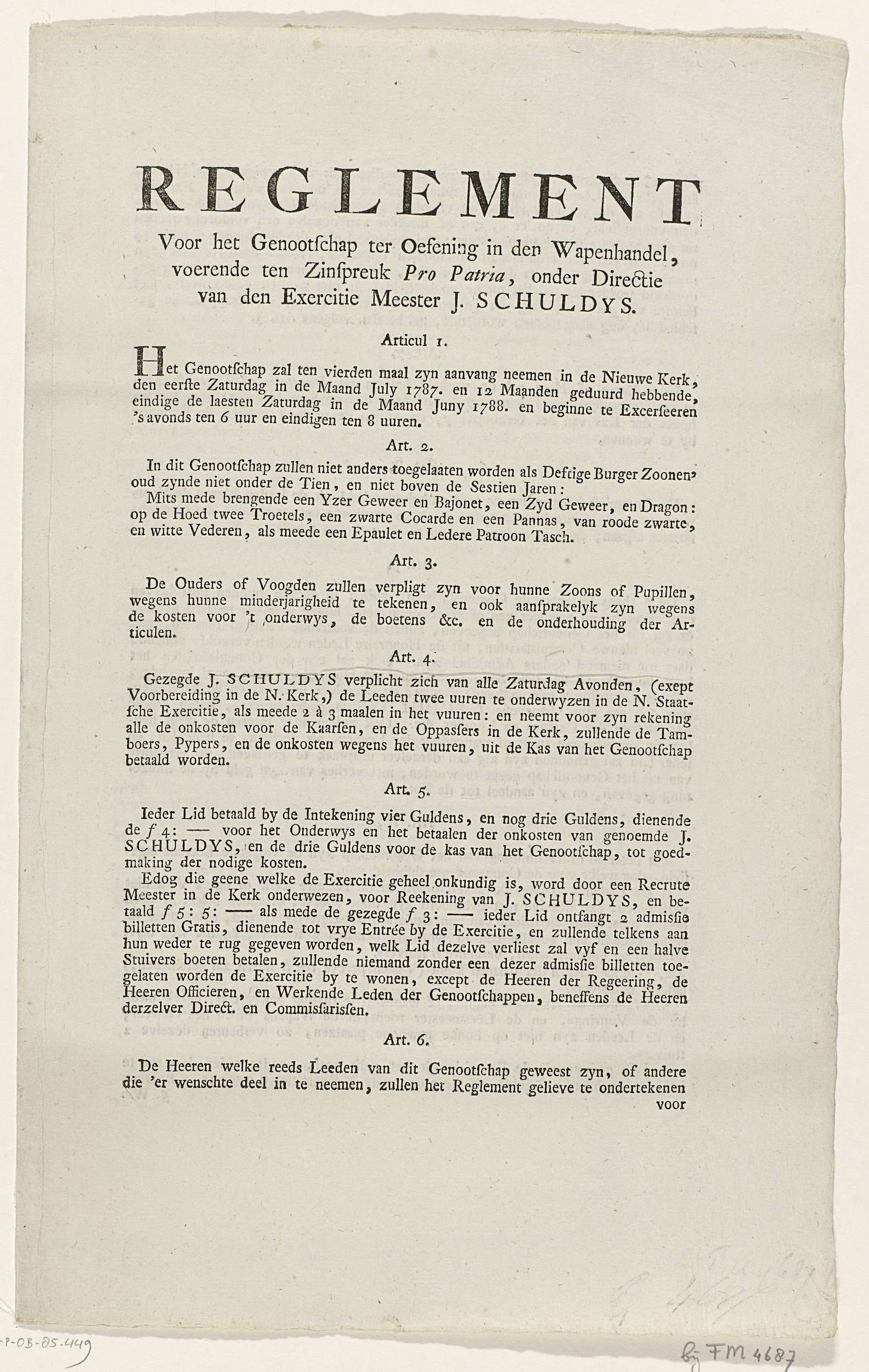 Tekstblad met het reglement van het Genootschap ter Oefening van de Wapenhandel Pro Patria te Amsterdam. Dubbelgevouwen blad bedrukt op drie bladzijden met de 13 artikelen van het reglement van het genootschap opgesteld op 1 juli 1787 door de exercitie meester J. Schuldijs.